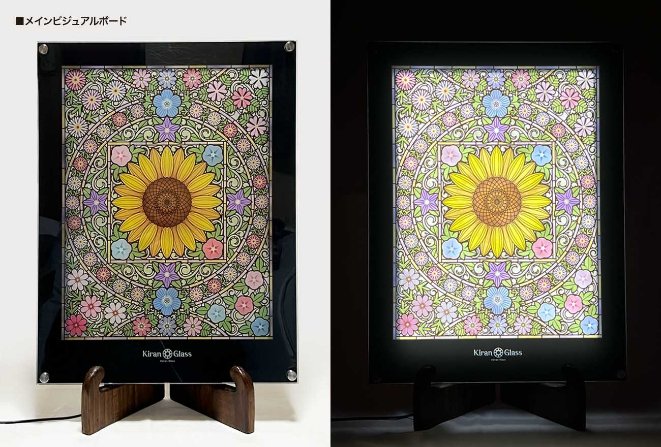 本商品は「曼荼羅」と「ステンドグラス」を融合したアクリル商品であり、光を利用していることから、ブランド名は「Kiran」に「Glass」を合わせた「Kiran Glass」としました。「曼荼羅をもっと身近に感じてもらう商品」をコンセプトに、現代美術として新たにデザインした「曼荼羅図」を、インテリアとして商品化いたしました。