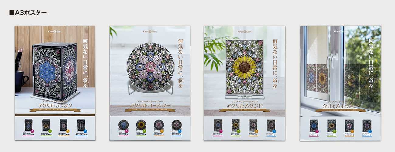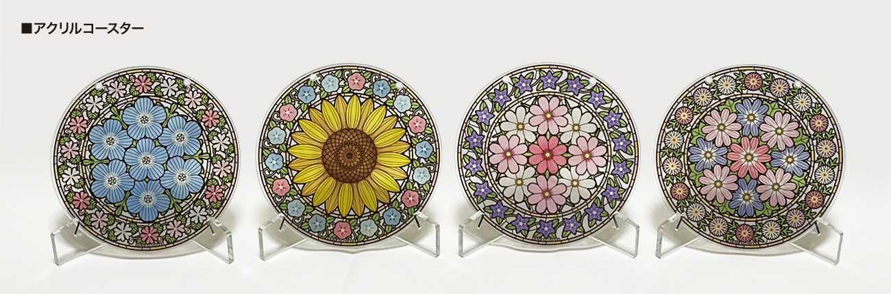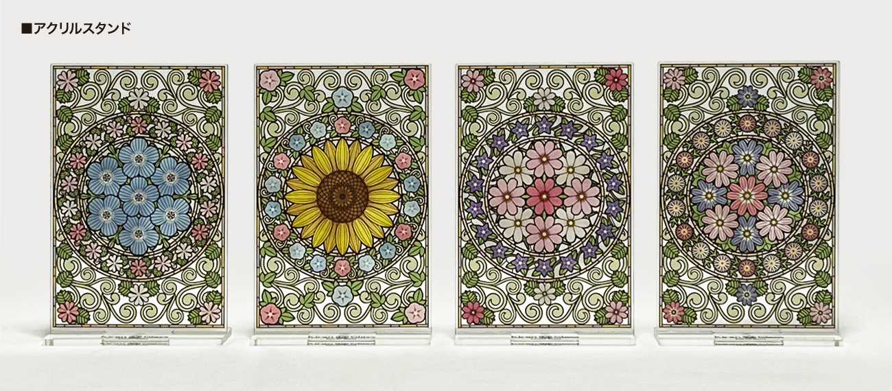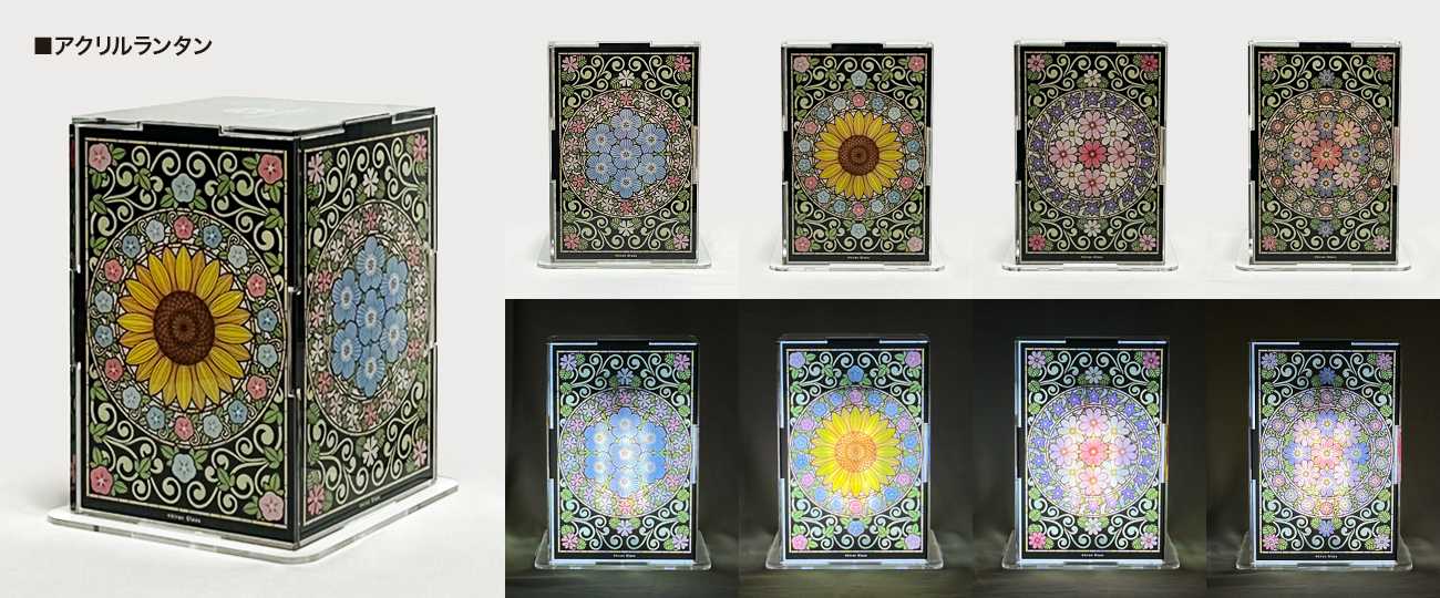 「花」をモチーフに現代アートの解釈で描き起こした、ステンドグラス風「曼荼羅」のアクリル商品企画。