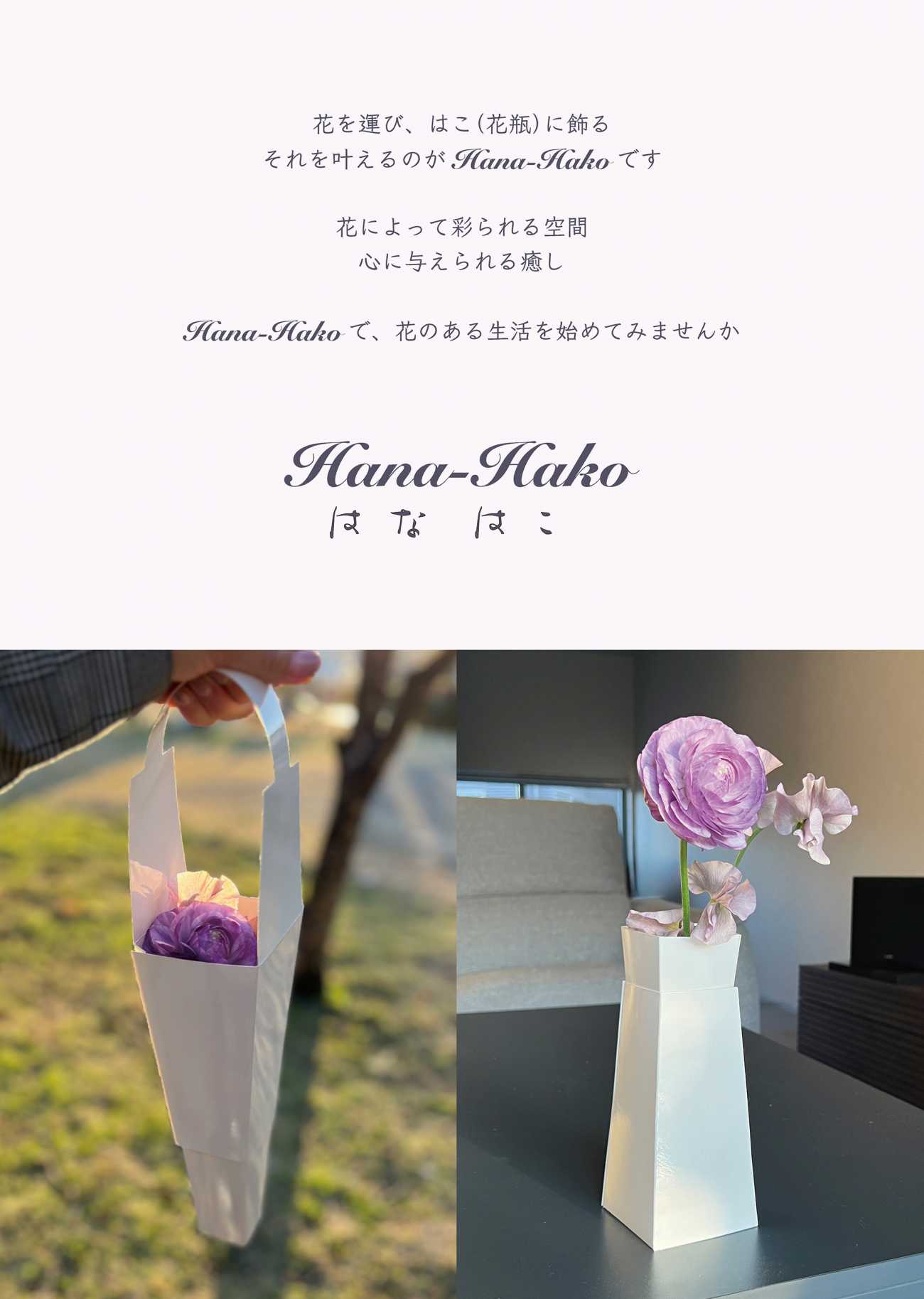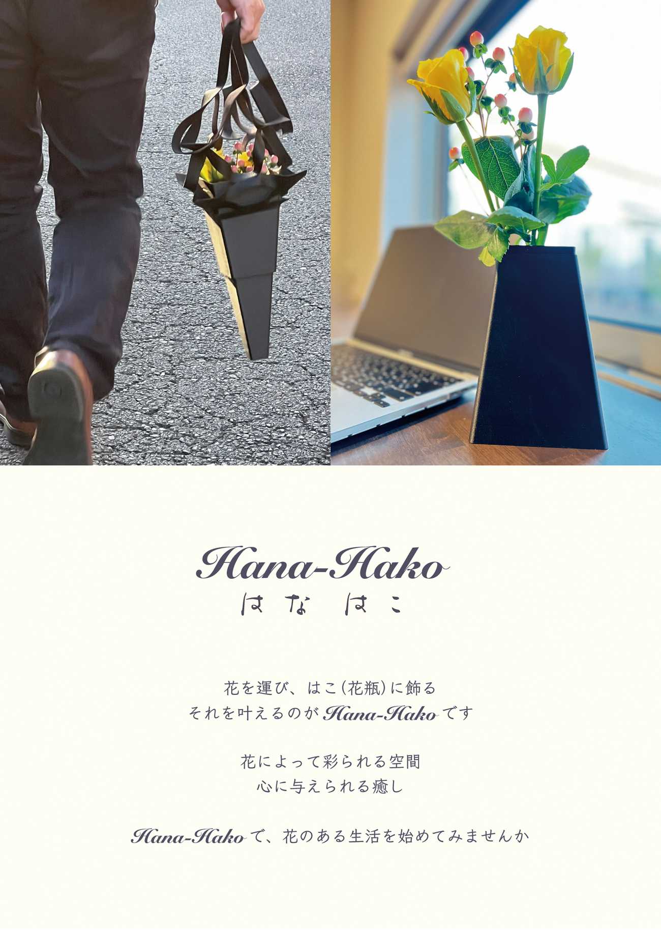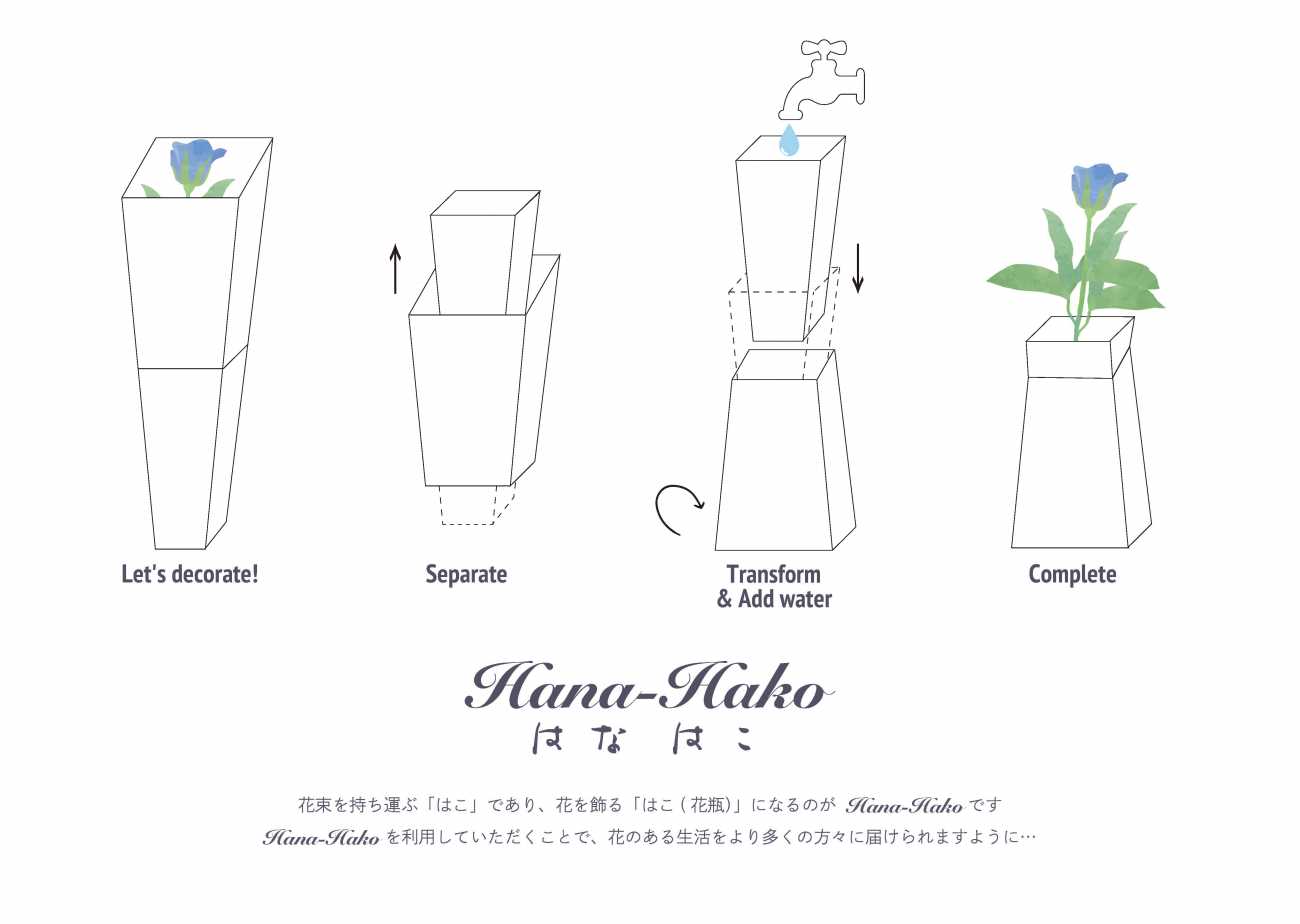 日々の生活の中で花を飾ることが増え、花のある生活の良さを感じていていた実体験の中で、持ち運びをスマートにし、花瓶を容易に提供することができれば、より多くの方々に”花のある生活”を提供できるのではないかと思い、持ち運びと花瓶という両方を兼ね備えたハイブリッド花瓶を制作したいと考えるに至った。