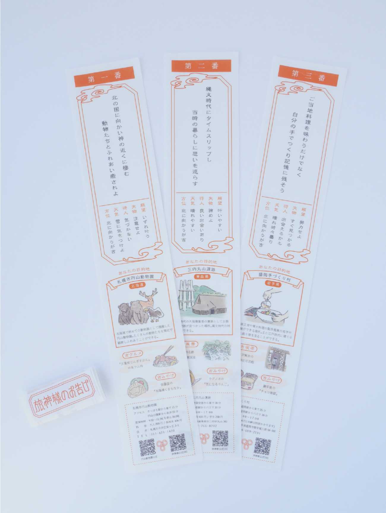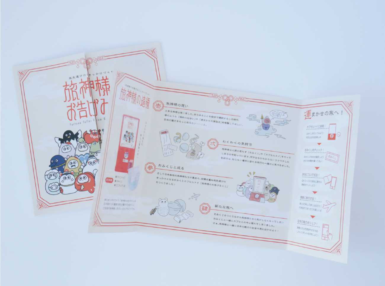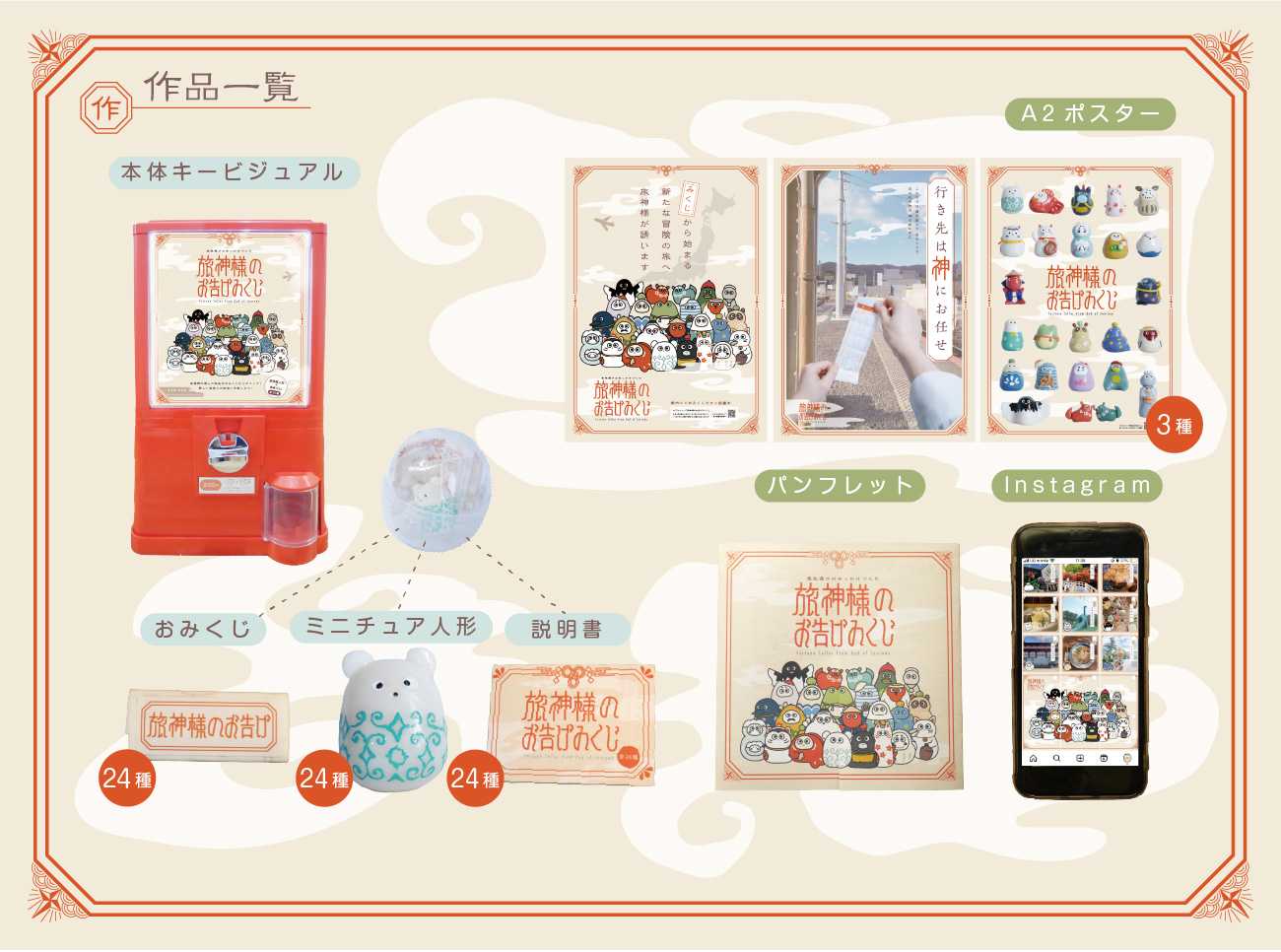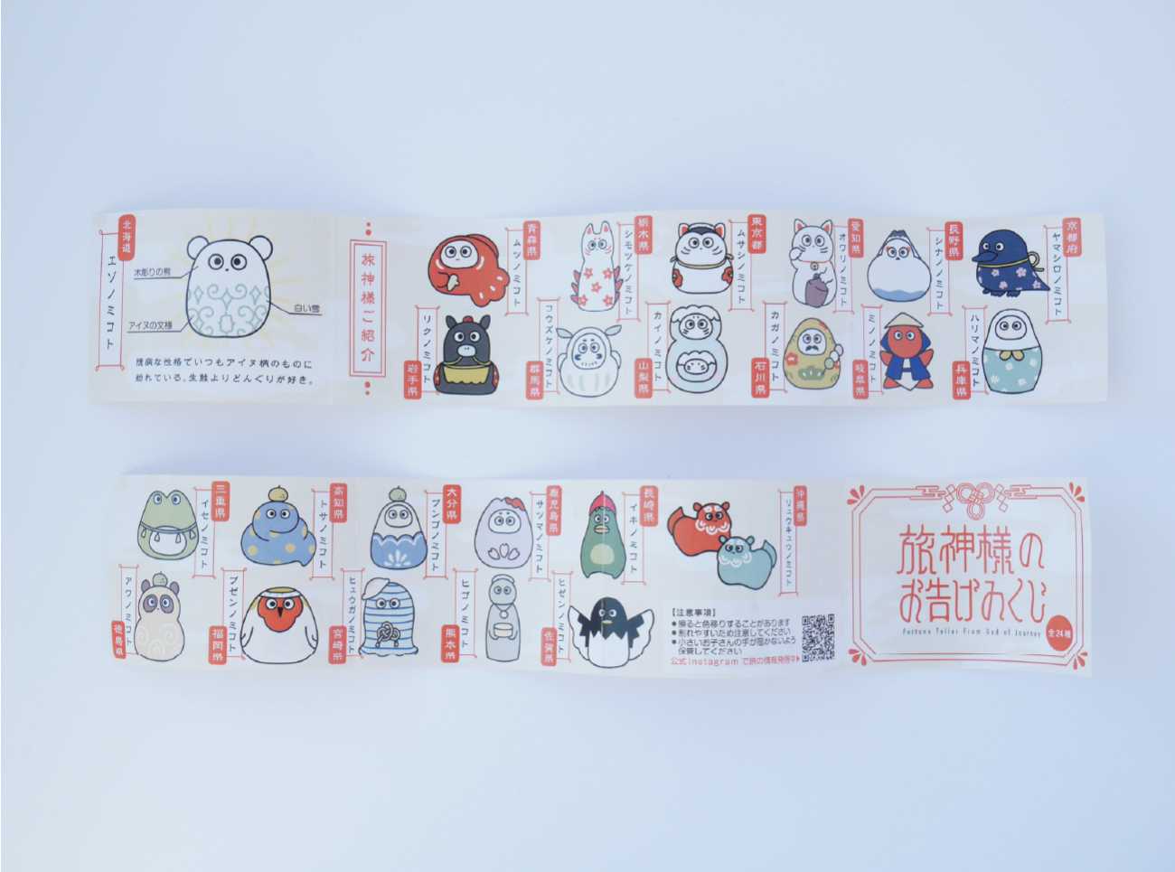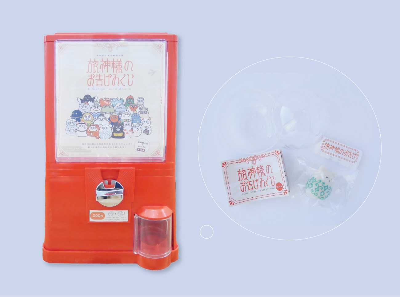 新たな旅行のきっかけづくりをテーマに、運任せの旅を通じて新たな日本の魅力に出会う「旅神様のお告げみくじ」を制作しました。旅神様からのお告げが書かれたおみくじとご当地の旅神様人形が入ったカプセルトイです。旅神様のキャラクターは、各地の伝統工芸や名産品などがモチーフになっており地域を知るきっかけにもなるはずです。