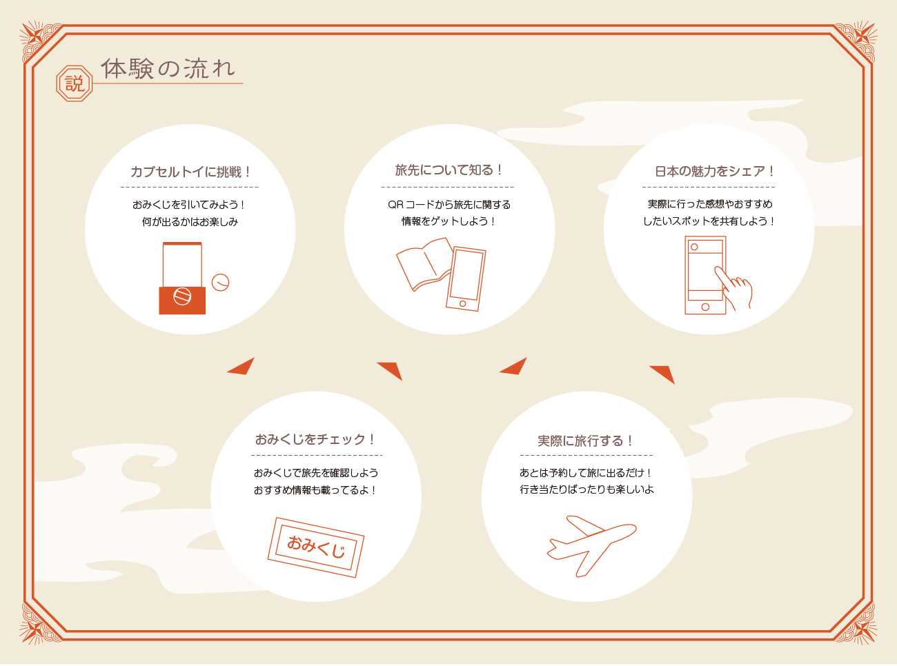 カプセルトイから始まる旅の流れ。おみくじは旅先を選ぶきっかけとしての機能を果たす。