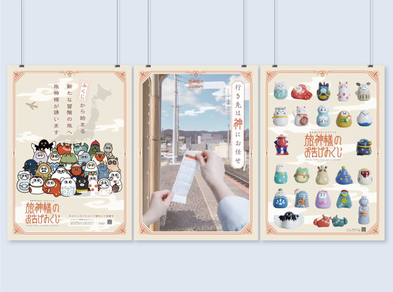 A2サイズのポスター3種。メインビジュアル、この旅の企画を伝えるもの、旅神様の魅力を伝えるものの3パターンを制作。