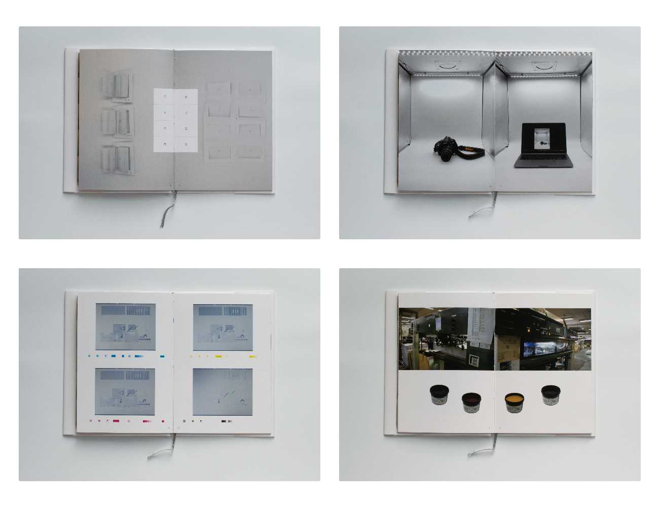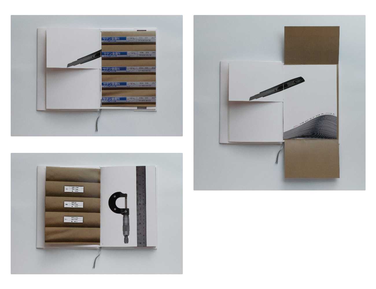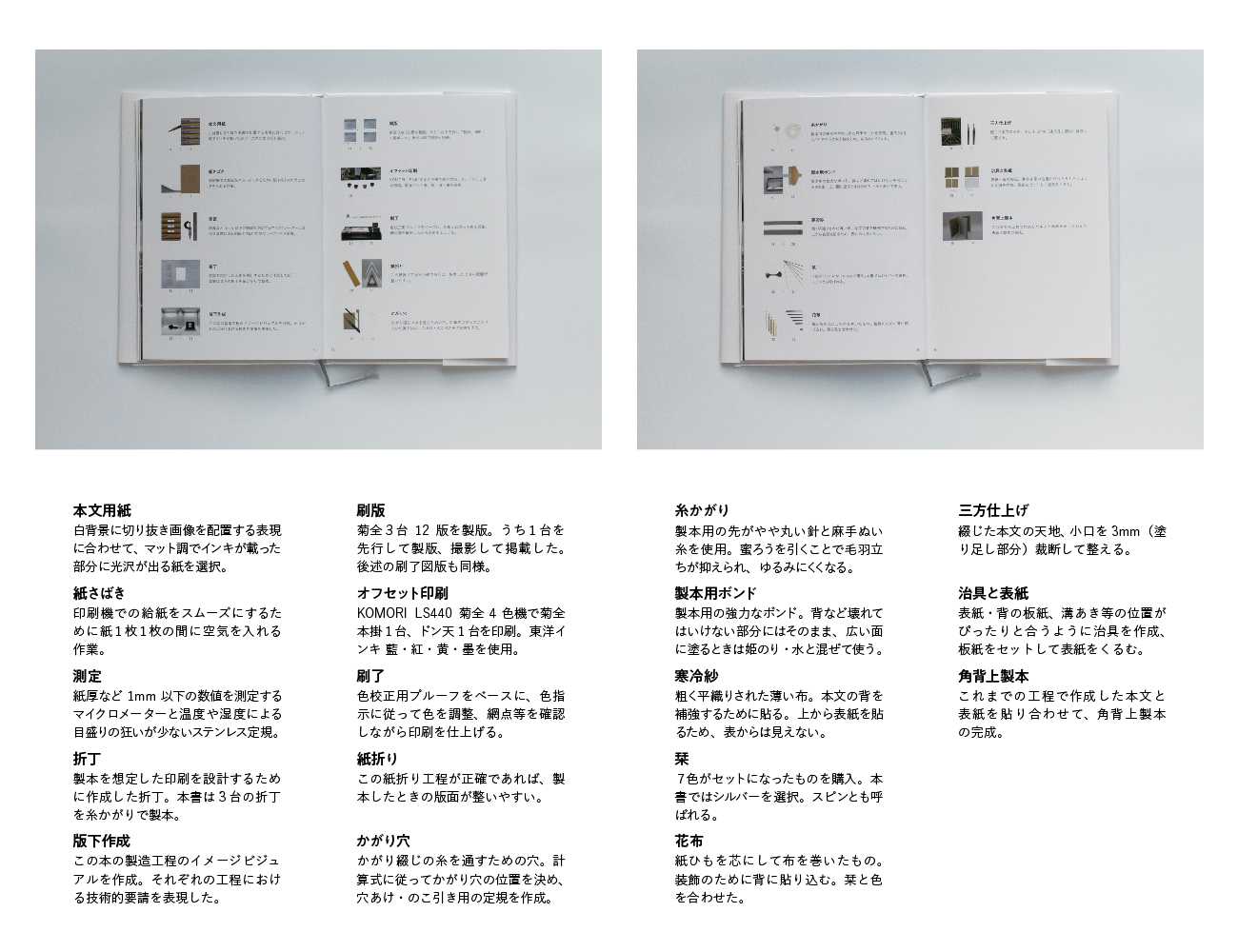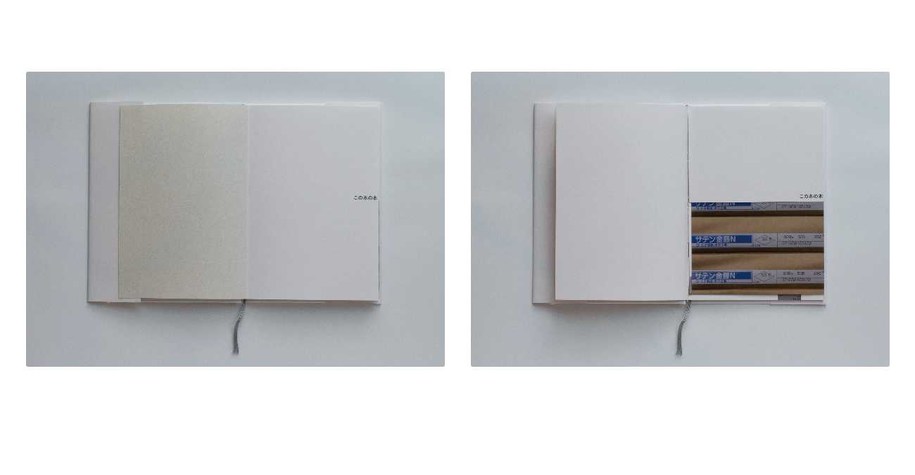 作品である「この本の本」をつくる際に使用した資材・道具などを収録し、造本の各工程における要請を可視化している。本文の印刷風景を撮影した図版を収録するなど倒錯の要素を含む。ジャケットは書籍本体の図版を配置し、あえてその図版箇所以外にニス引きをすることで、閲覧や経年による本の状態変化の表現を試みている。