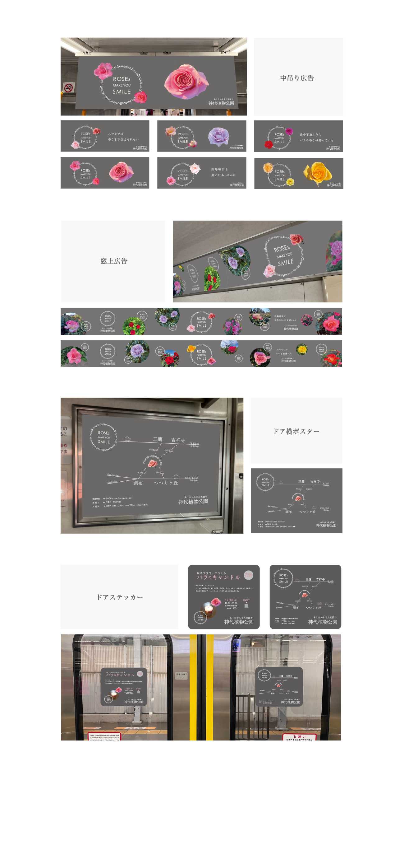 この植物園は、来園者のほとんどが年配の方である。働き盛りの若い世代にもバラ園で癒されてほしいと思い、広告のイメージを一新した。ターゲットは、通勤電車に乗っている女性。満員電車という閉鎖された空間から、あるいはスマホの小さな画面から、広大な植物園に連れ出したいという想いを込めて、電車をジャックする広告を制作した。