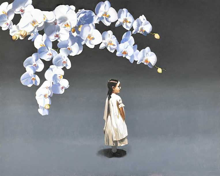 蘭は、草木の四君子として知られ、白は清浄、穢れがない。茶室を例にとると、路地を通り、小間といわれる四畳半の躙り口から、身を屈めて入る。その時、視線の先に飛び込んでくるのが、床柱に掛けられた花である。仄暗い場に僅かな光が射し、白い花が目に入る。その瞬間、招客はここが穢れのない場であると知る。膨らみ始めた蕾は、俗世の塵芥を知らない。ある時までみられる少女の透明感は、壊れてゆく儚さを内包する。少女の無垢、穢れなさの面影を白い花に重ねる。