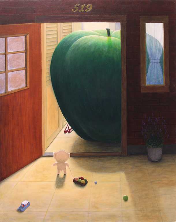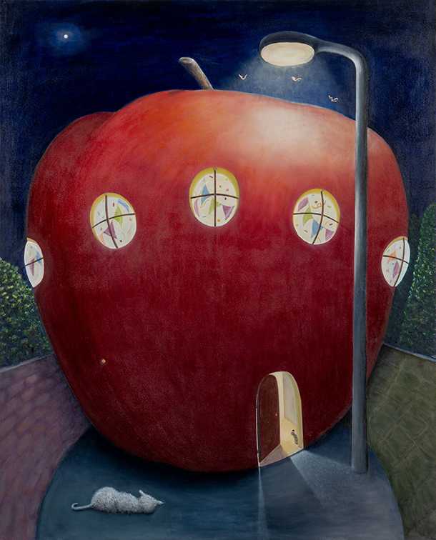 夜の路地でこんなことが起きていたら…。街灯に照らされた大きなリンゴの中でパーティーをしています。道の猫は寝ころびいつもの様子。闇は怖いもの、でもそこに灯りがあれば私たちは安心します。灯りは人の想いそのもので、あたたかさや優しさを与えてくれる存在。さあ、少し開いたドアの中へ入ってみてはいかがでしょうか。静かな夜の小さな幸せを感じてみてください。