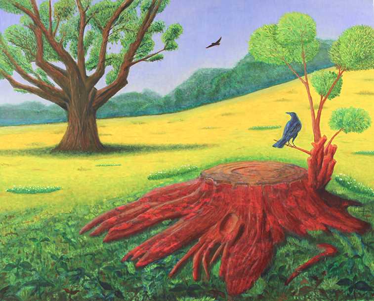 私は土偶や三面六臂の仏像などの造形物に興味を持っている。また洋画の習作では何作かサボテンをモチーフとした。そのような中で、千手観音が蓮華座ではなくサボテン(和名は仙人掌)の座に鎮座し、個々のサボテンで千手を表現できたら面白いと考え、本作の制作に着手した。最大の課題は、一体であるべき仏像本体とサボテンの千手の材質感が違いすぎることであった。より異質な幻想の赤い手を光背として配置し、周囲のサボテンには手に模したクジャクサボテン様の花をあしらうことで表現を試みた。