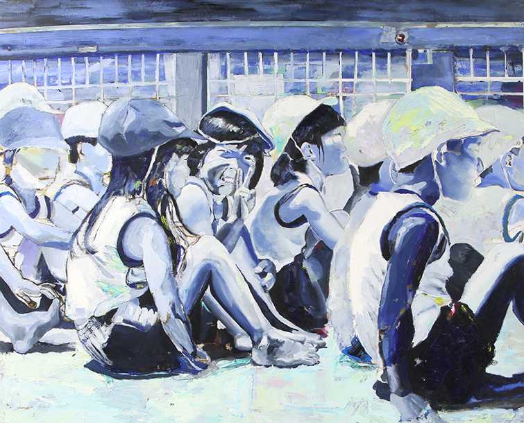 小さいころからテレビアニメを観たり、漫画を読んだりしていた。よく人を描いていた。好きな作家の真似して描いたり、時にはクラスメイトに頼まれて描いたりしたこともあった。卒業制作が群像になったのは小さい頃の名残がまだある為なのかもしれない。子供の無邪気さや真っ直ぐに良いことも悪いことも発散するエネルギーがらしさだと考える。赤・白・黄を主に色を置いた。青色の代わりに、赤と青を混色した紫を服や肌、髪におき、影にも入れたらキャンバス全体に響きあいができた。