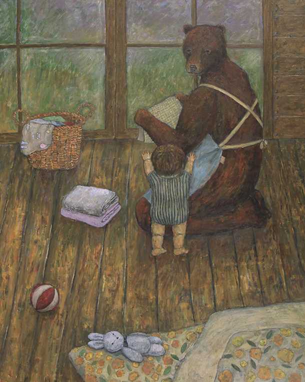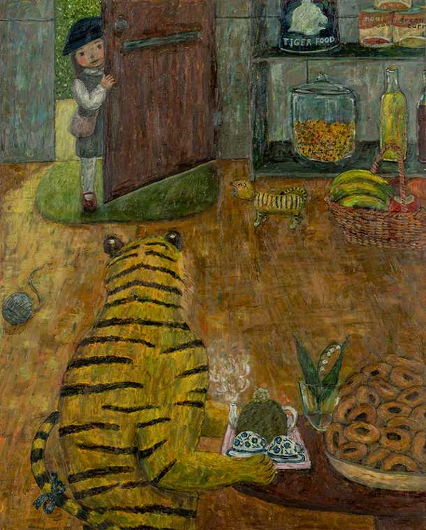 幼少期から好きな絵本「おちゃのじかんにきたとら」の後日談を想像し、この間のお礼にとトラが女の子をお茶に招く場面を描いた。原作で描かれている、不安と温かみが入り交じったような不思議な雰囲気を出せるよう意識した。