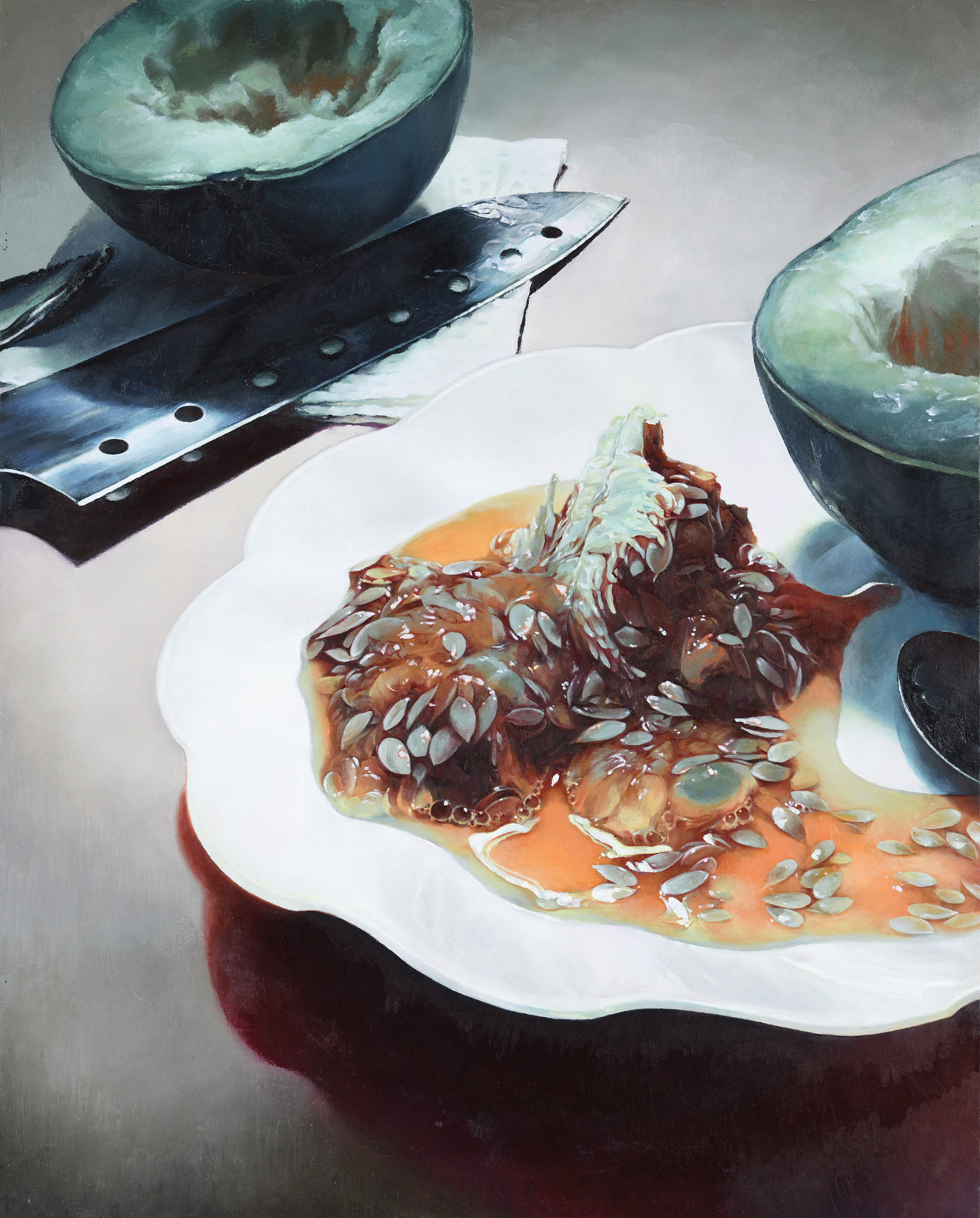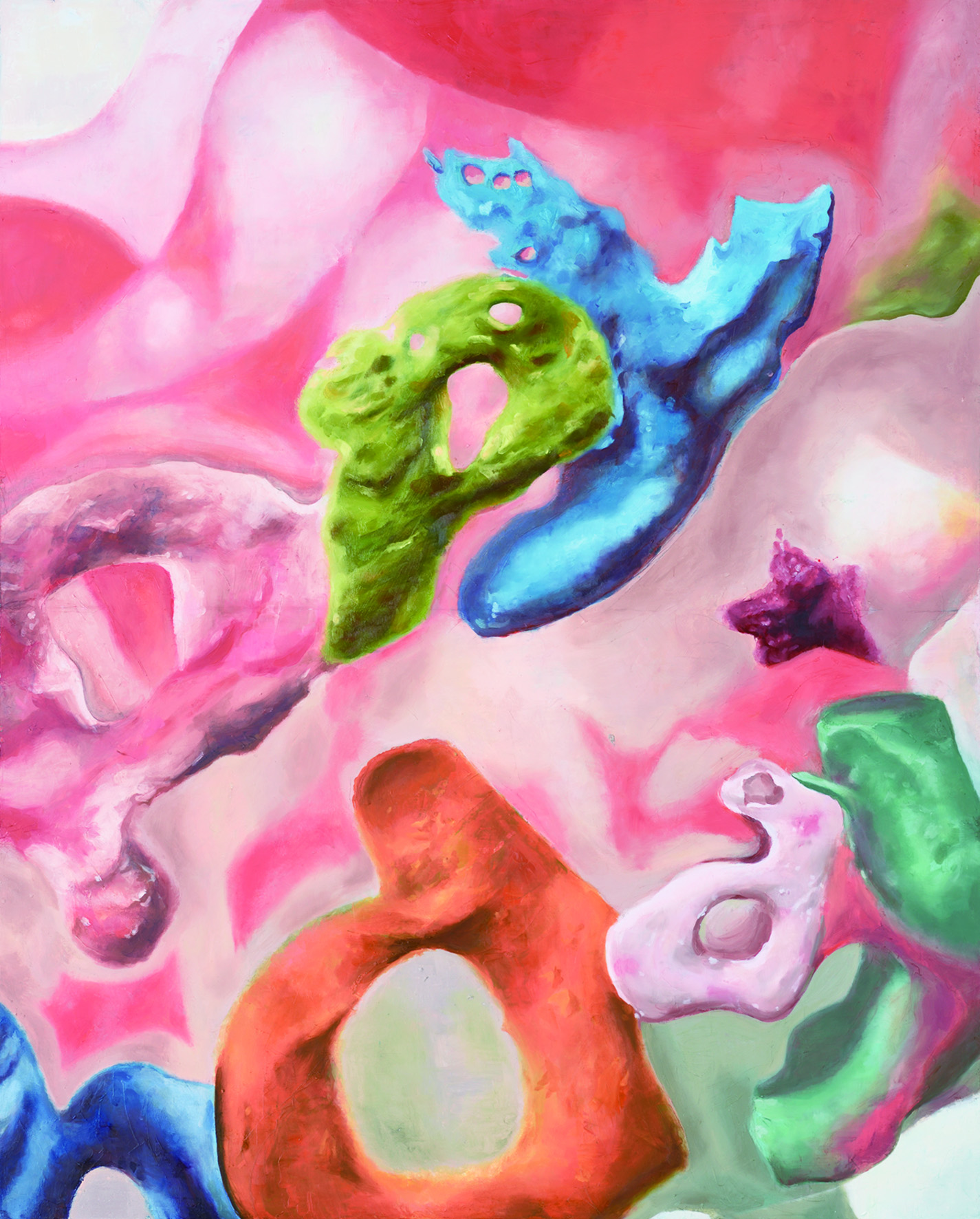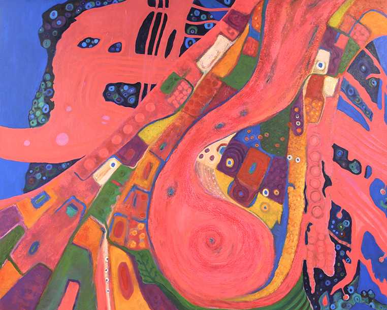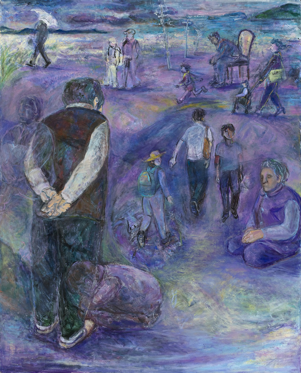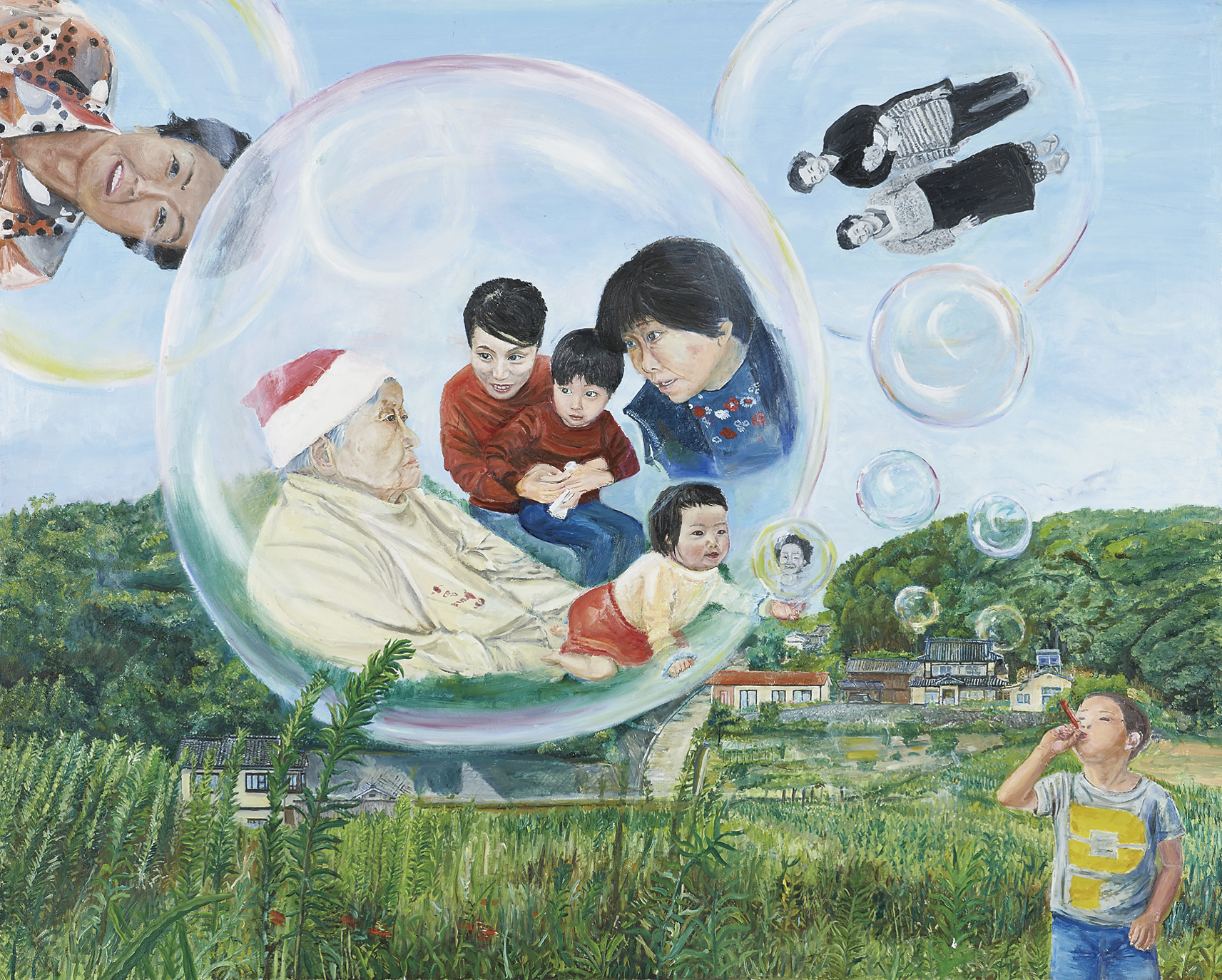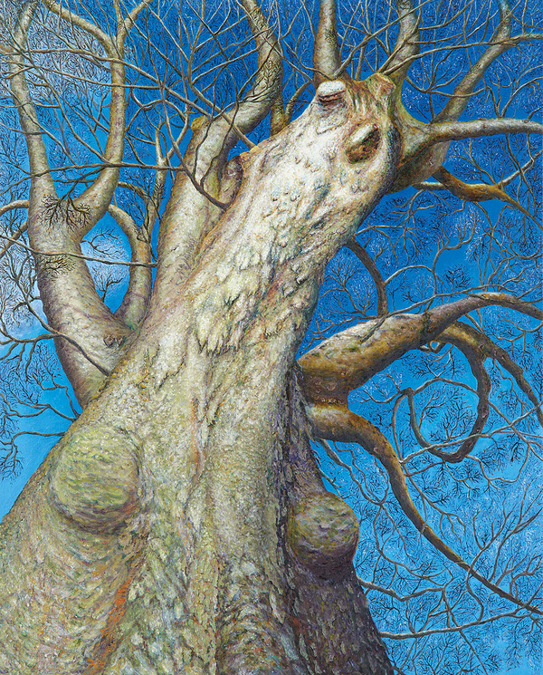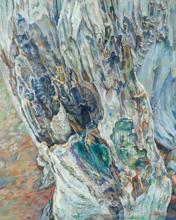 樹木は花を咲かせようと何度も四季を巡り、生命の循環を繰り返してきた。天に向かって伸び、大地に根付き、今日もそこに存在する。無数の筆触で自然との響き合い、内側を流れる生命力を幻想的に描き、具象と抽象が入り混じった作品が生まれた。見方が自由になると、写実で描き始めたものが面白い表情に変化した。