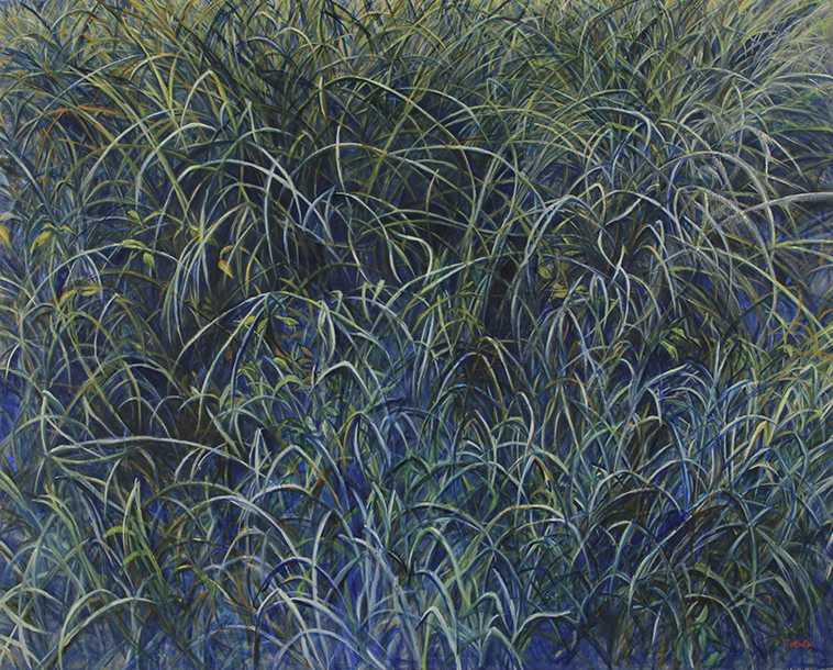 以前から葉っぱに興味があり、それが生み出す情景を好んで描いている。2枚制作するにあたって、色の変化を楽しみに描いた。ウルトラマリンをいかに活かして表現できるかを楽しんだ。イエローとイエローオオカーを微妙に使いその響きあいが美しいと思った。もう1枚は風を意識した。シーズンは冬なので、カサカサと葉が鳴る様子を目指した。画面に必要なのは塊だと再認識した。描き起こすのも大、小とり交ぜて塊ごと表わして行くと画面に動きが出る。線で描いているので特に塊が大事である。それにより動きも出る。