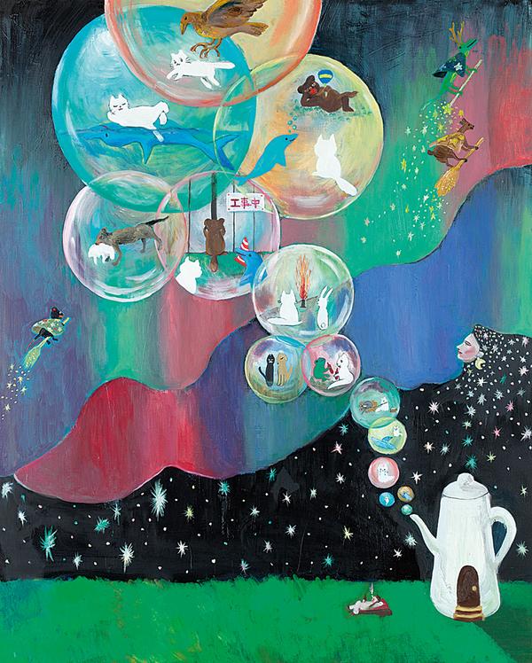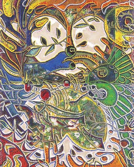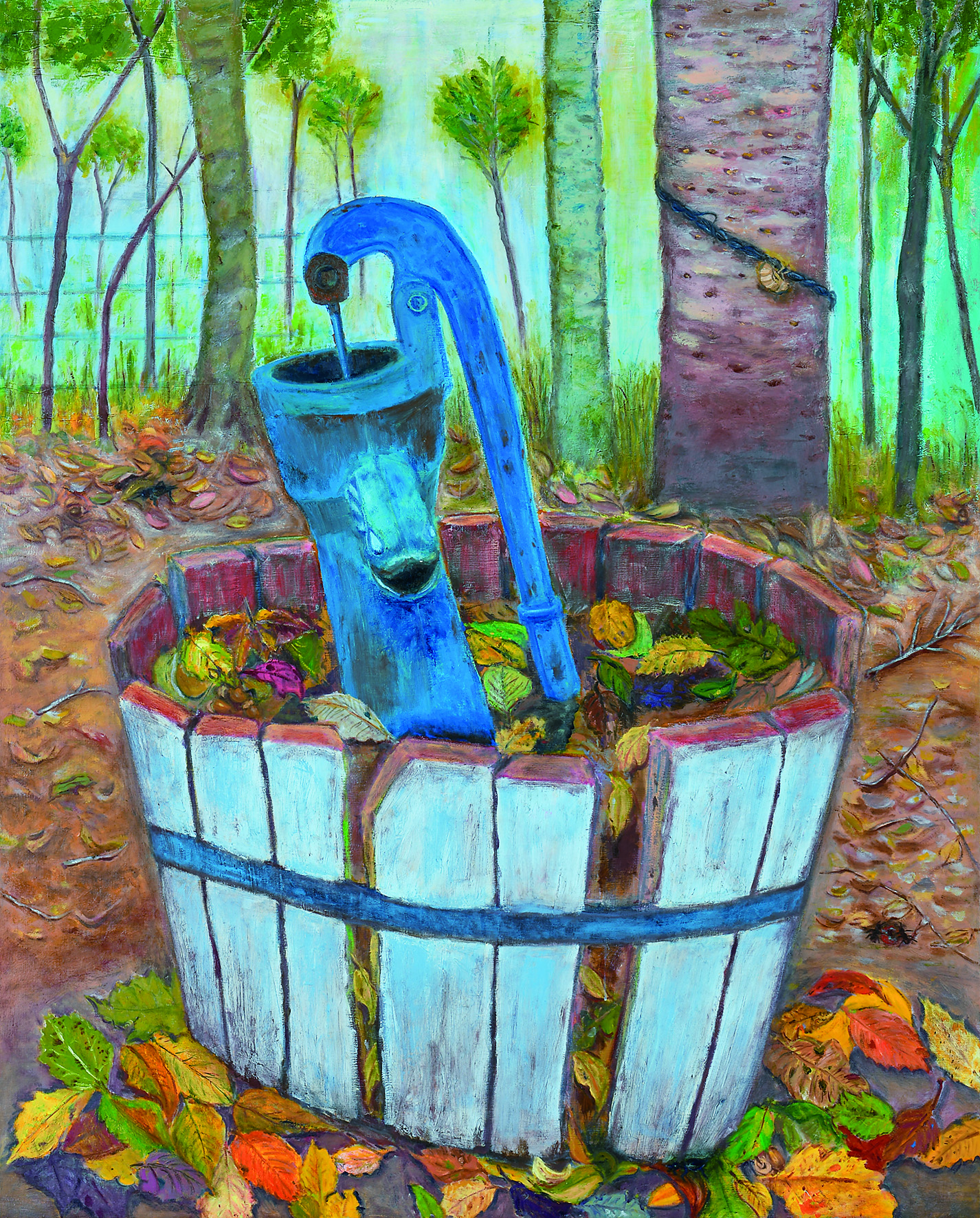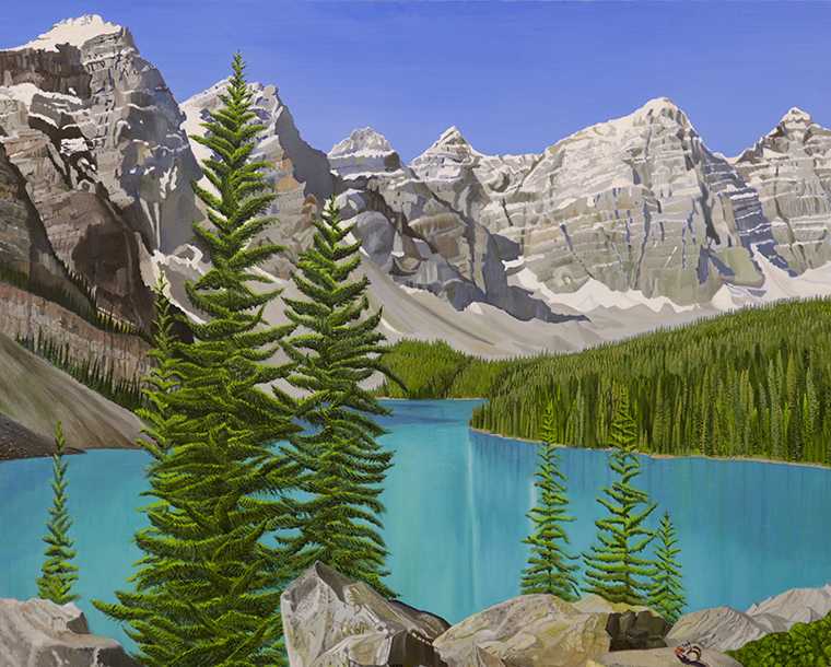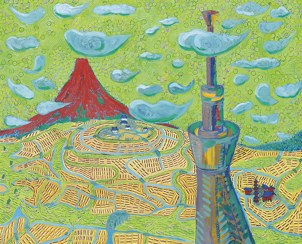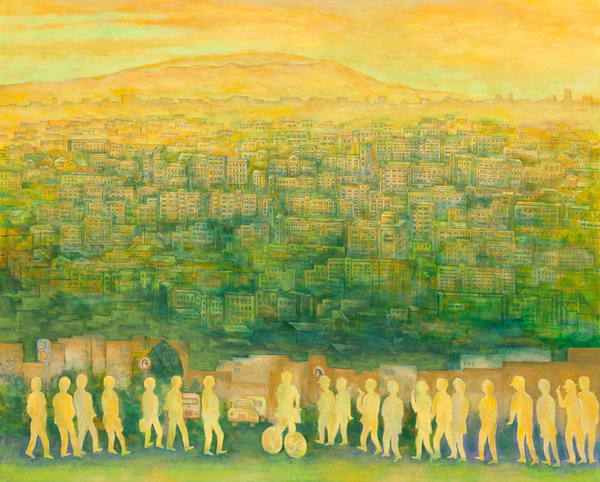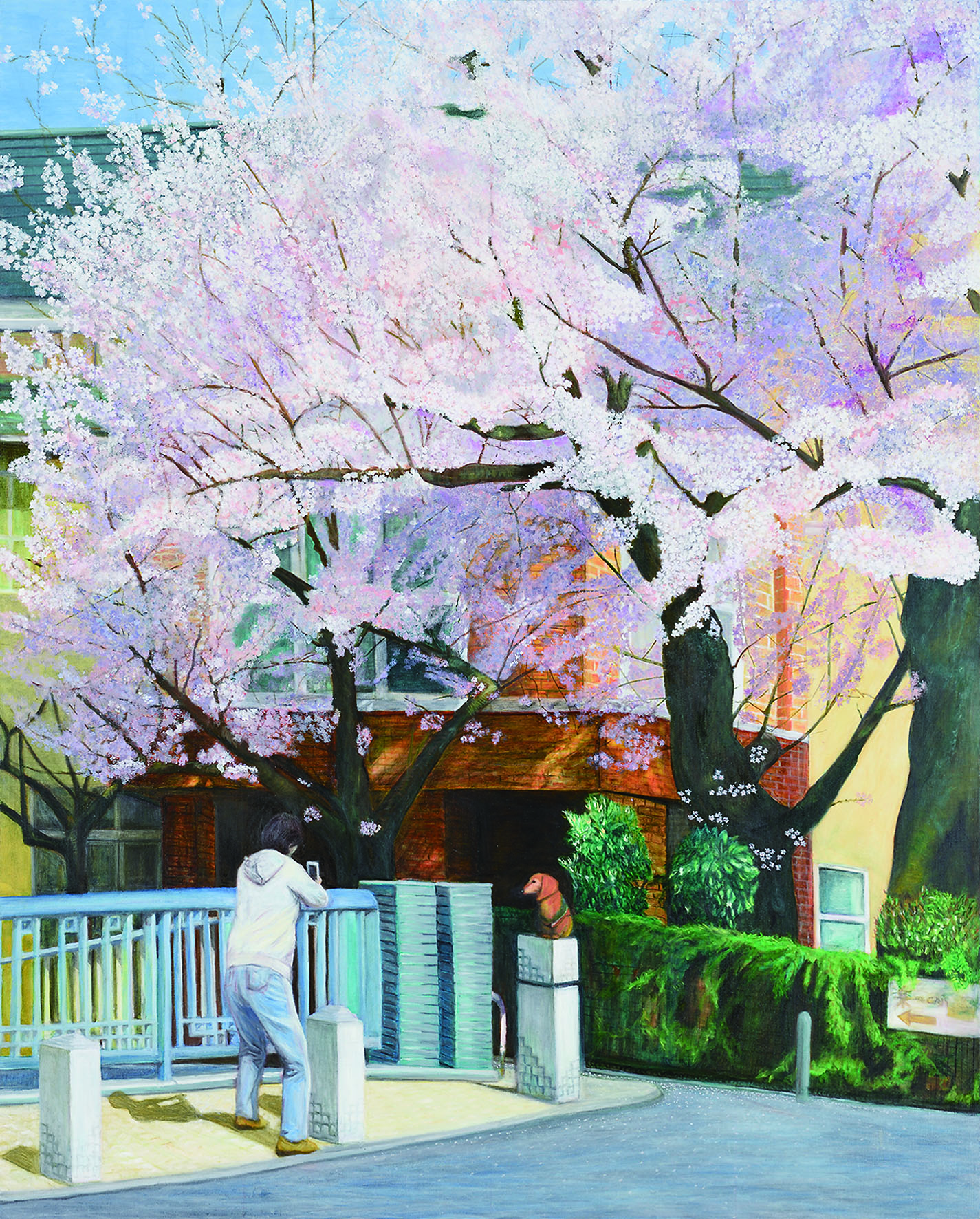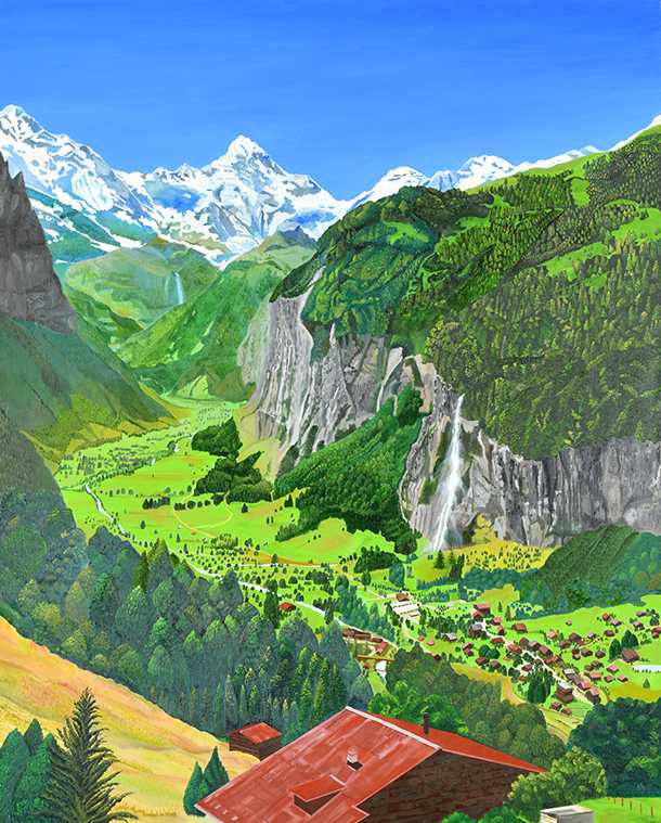 スイス・ラウターブルンネンは、夏でも雪の残る3000m級のスイスアルプスの山々に囲まれ、氷河が作り出したU字谷、落差300mのシュタウプバッハ滝など多くの滝がある景勝地である。登山鉄道でアイガー、メンヒ、ユングフラウを見晴らす広大な牧草地を抜け、くねくねと丘陵地帯を下ると、急に、谷の村々が眼下に広がり、感動して車窓より撮影した場面を絵に表した。空の青さに雪を抱いた山々の白さ、牧草の鮮やかな萌黄色に針葉樹林の濃い緑、牧草の萌黄色に家々の屋根の赤茶色。雄大な自然と人の営みに圧倒された。