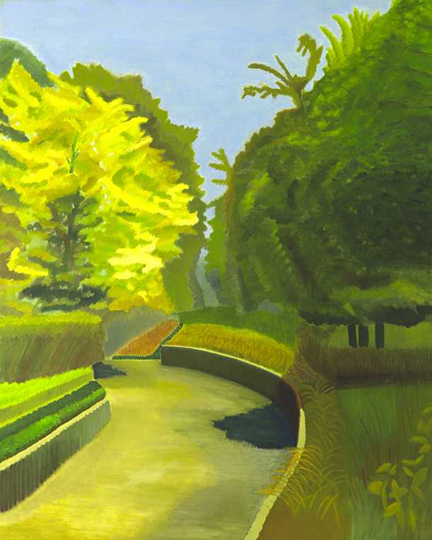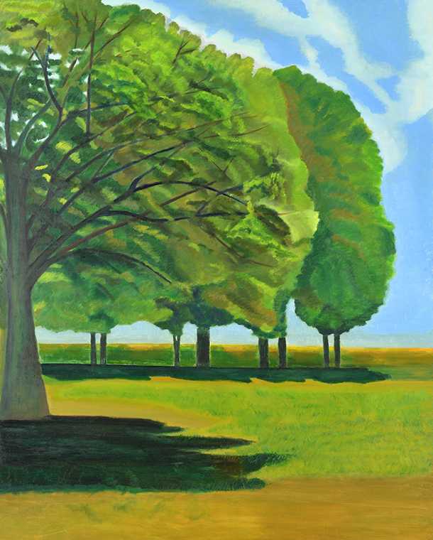 身近にある風景の中で公園の広々とした広場に惹かれた。木々の葉にあたる太陽の光の具合を表しながら木々の生い茂った様子や、草である芝生の様子を表しながら草のはいつくばって生えている様子から、初夏のにおいがただよってくる。初夏の太陽の日差しを感じながら、木々や草からにじみでてくるその場で生きている力強さが感じられる。広場の空気がゆっくりと流れ、太陽の光から眩しさを感じられるような日常の一瞬を捉えて、今をかみしめる。