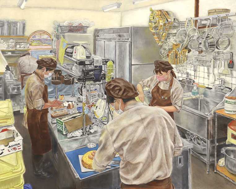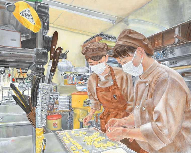 「働く人」は私の身近に働いている人々の姿を描くシリーズである。現地取材を中心とした制作のアプローチの楽しさが新たな絵の世界を実感させてくれた。今回はケーキ工房で働く人々を描いた。人の育成にも力を入れている師匠がパイを作りながら今年入社した弟子に作り方のこつを教えている。弟子が真剣に師匠の手元を見ている姿を捉えた。細かい観察により師匠と弟子の関係を写実的に描写した。