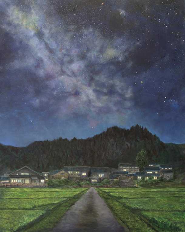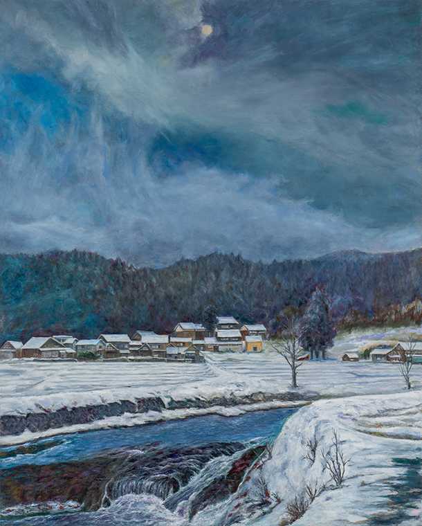 珍しく青空が広がった冬の空。一転、太陽が見る間に雲に覆われ雪が舞い始めた。自然のダイナミックな展開と静寂に包まれた故郷を描いた。