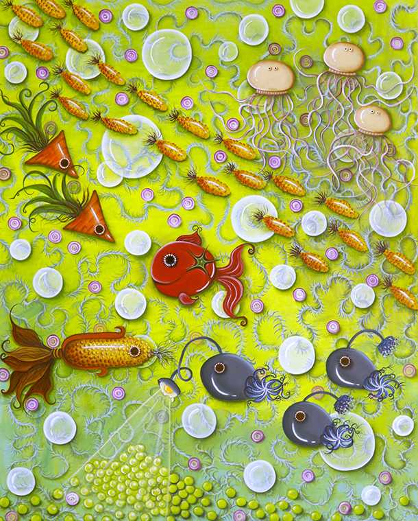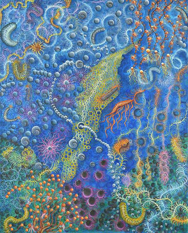 擬態というキーワードから始まった作品である。自然界では、地上でも海の中でも、多くの生き物たちが擬態しながら、生きている。この絵の中にも、空想の不思議な生き物たちが多く隠れている。色や形をカモフラージュしながら、画面いっぱいに増殖している場面である。その様子を自由な発想で表現した。