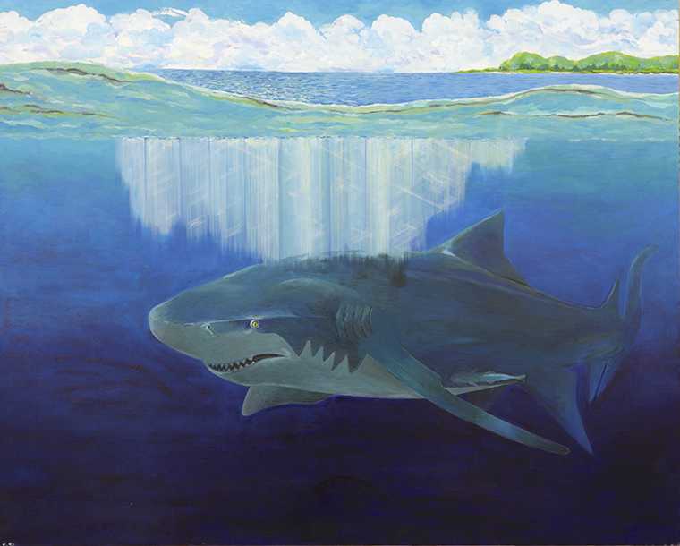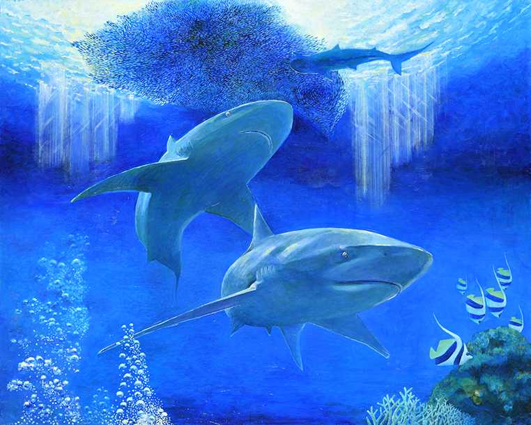 平面空間のなかに3匹のサメを描いた。どの様に構成するか、悩んだ結果大きいサイズのサメ、それより小さめのサメ、もっと小さいサメの構成が決まり後の空間になにを表現するか悩んだ結果小魚の集団の群れの表現。波間を照らす太陽の光が海中に降り注ぐ光のシャワーの表現。画面上に奥行きを出すために、ダイバーが吐いた泡の表現、これらをひとつの画面構成にどの様に描くか、情報を写実的増幅し、感情が入り混ざってモチーフを再現した。如何にオーシャンブルーの世界に光を溶け込ますか悩む。