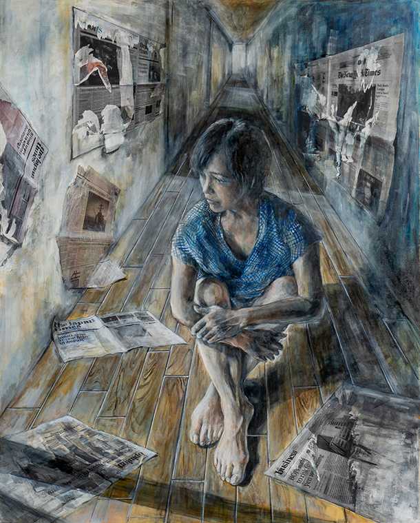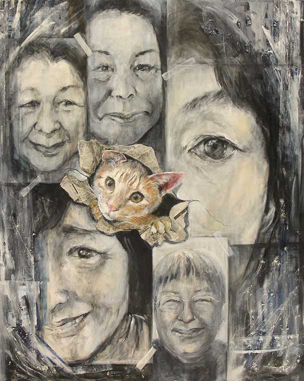 情報の嵐で混乱し現実がぼやける。そんな様々な視点で世界を見るうちに自分の考えが揺れ動き、確信を見失うこともある。キャンバス全体に広がるコラージュは、デジタル時代における情報の急速な増加や複雑性を象徴している。色彩の変化や形の歪みは、情報が多岐にわたり、変化しやすいことを示唆している。鑑賞者に、情報過多での思索や整理の難しさを感じさせたい。