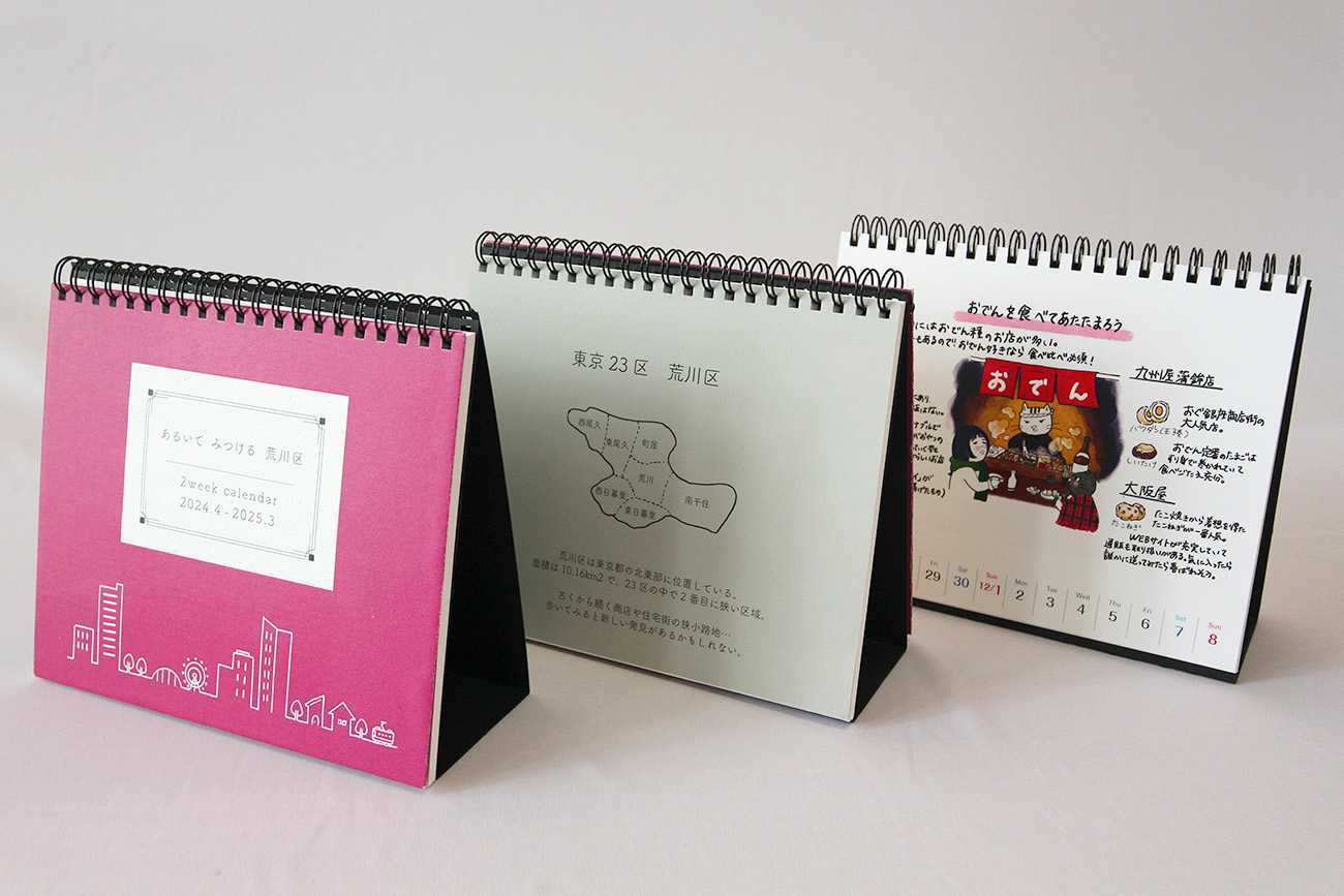 「暮らす街をもっと楽しく」をテーマに、住む街を歩いて発見したことや新たな楽しみ方をイラストと手書き文字で紹介するカレンダーを作成しました。自然と目につくように卓上カレンダー(2週間めくり)の形式にし、カレンダーの役目が終わっても取っておいてもらえるように、製本はダブルリングのスケッチブック風にしています。