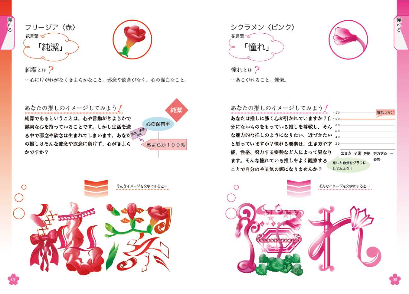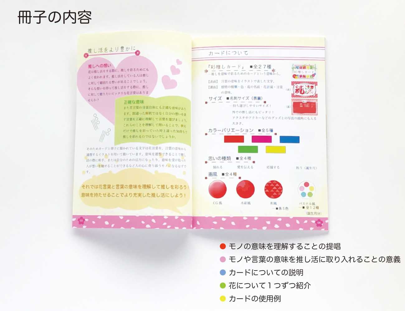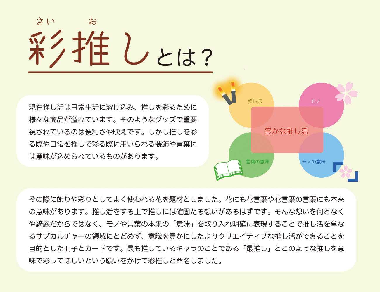 花を題材として、花言葉と言葉の本来の意味を理解しながら推し活を彩るための冊子とカードを制作しました。推し活を単なるサブカルチャーの領域にとどめず、さらに「意味」を取り入れることで意識を豊かにした、よりクリエイティブな推し活をするためのカードとその説明が載っている冊子です。