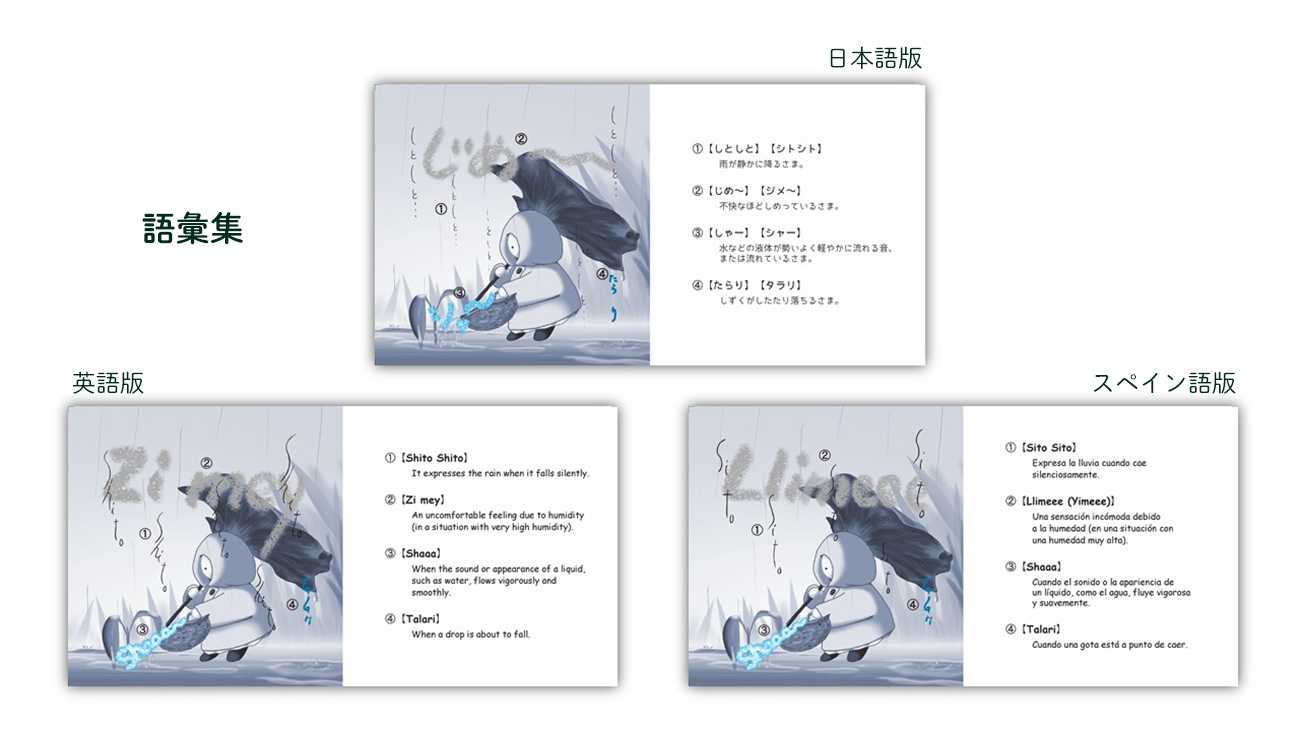 だれもが使うオノマトペの中のひとつ「擬態語」は、存在しない国も多いようです。状態や状況を音に模して表現する擬態語を共通語にすると、国境のない意思疎通が可能になるかもしれません。まずは話者の多い英語・スペイン語を日本語同様の発音になる文字にして、絵本と語彙集を仕上げました。3言語の音声の共有を、本書でお試しください。