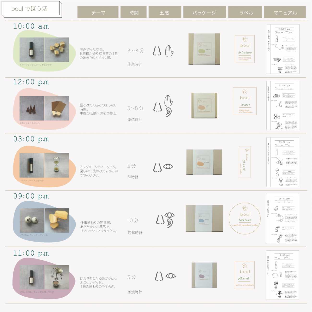 boulは日々の中にぼんやりを取り入れるために、1日の中で使用する時刻をそれぞれ設定したプロダクトブランドです。それぞれの時刻をテーマにしたぼう活のためのプロダクトを提案します。