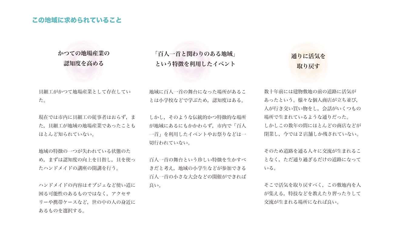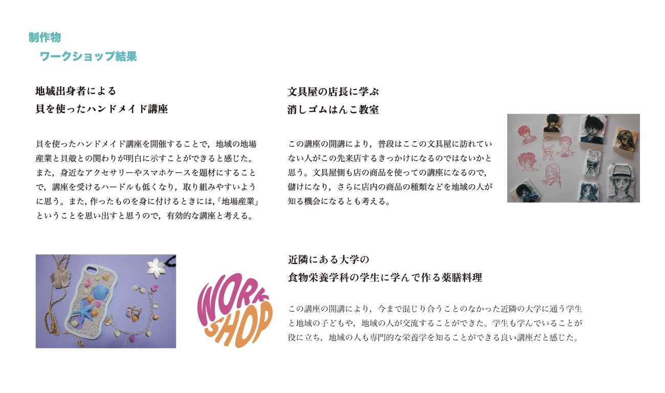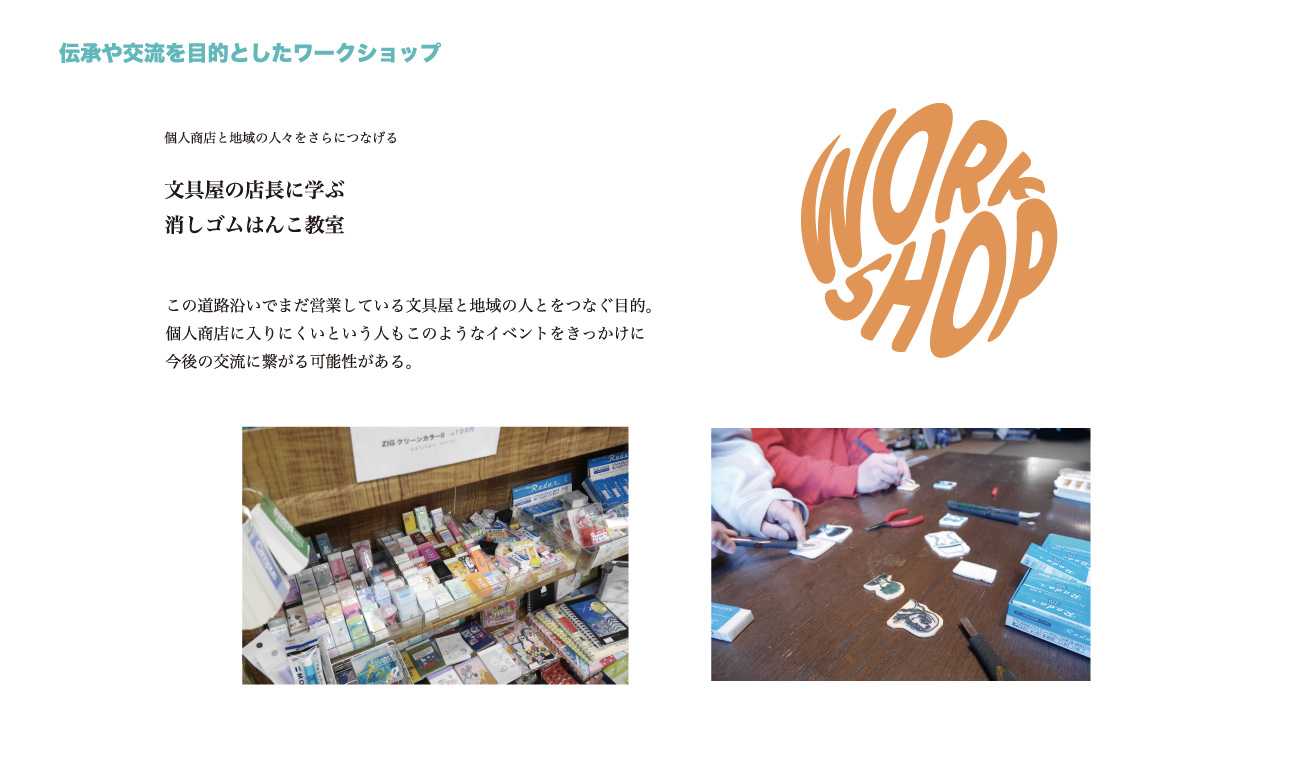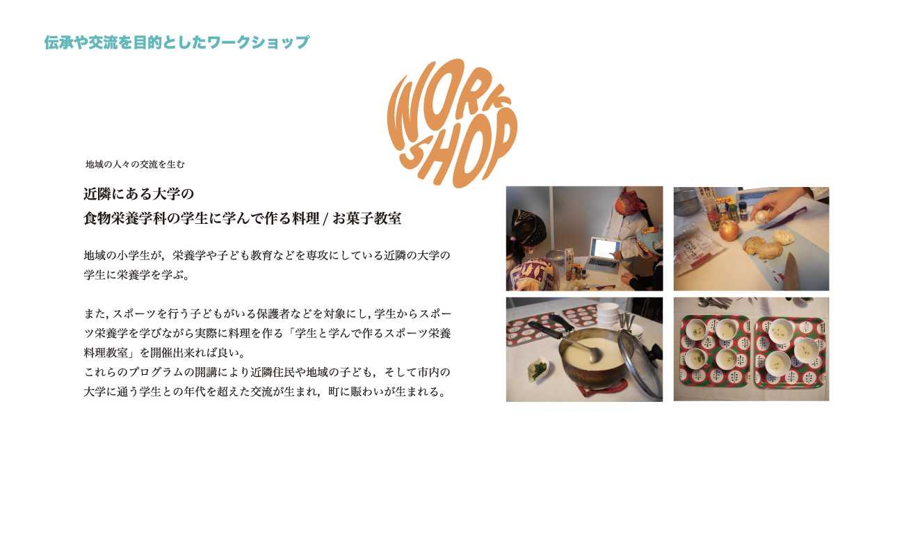 そして以前に比べ付近の商店が減り,人同士の関わりが希薄になったこの地域をワークショップなどのイベントや習い事を教えたり習ったりする場所として利用することで,少なくなった「交流」を再び生み出すことができないだろうか。"