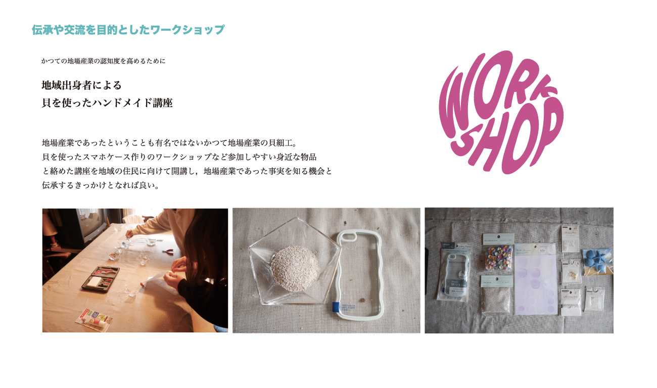 地場産業の貝を使ったワークショップで作成したアクセサリーやスマホケース/文具屋の店長に学ぶ消しゴムはんこ教室で作成した手作り消しゴムはんこ