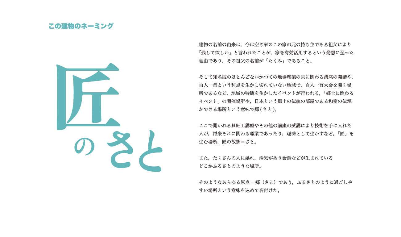 新築の和室採用率の低下とともに,次世代である子どもが日本の住宅様式に触れる機会は減っている。そこで,昭和の日本の作りであるこの家を次世代の子どもが利用できる場所にすることで和室に触れる機会となり,また,ほとんど知名度のないかつての地域の地場産業や,百人一首と関わりのある名所があるだけでそれを利用していない地域である現状を,この家を会場にしてイベントなどを行うことで地域の出来事や伝統を知るきっかけの場所にし,「伝承」へと繋げることはできないだろうか。