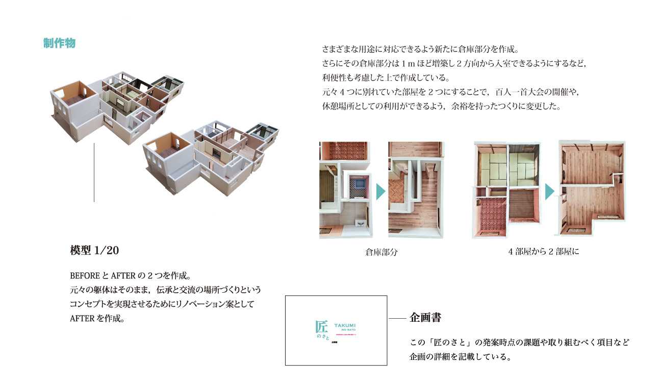 1/20模型BEFORE・AFTER(W:655 D:1125 H:135),A3サイズ企画書,伝承説明物(W:150 D:5 H:150)10点,リーフレットA4三つ折り
