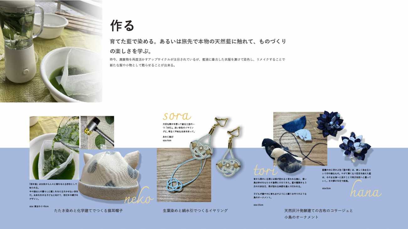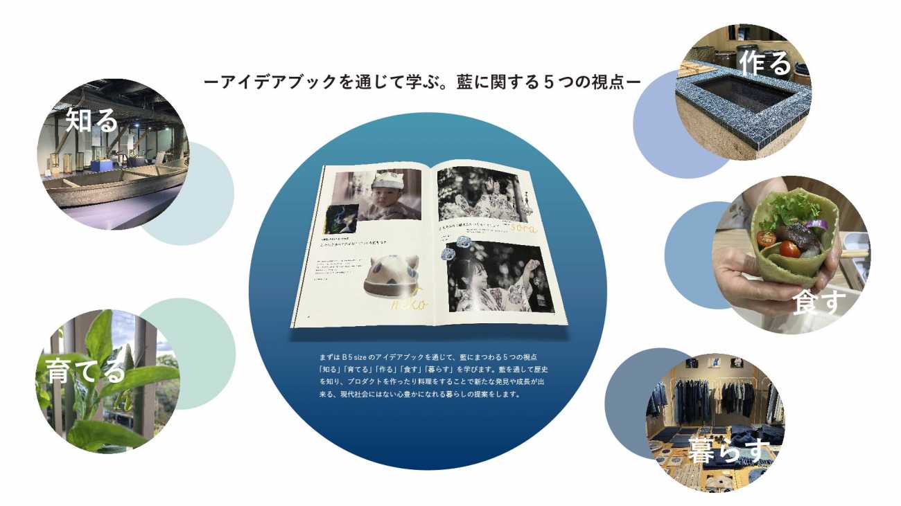 アイデアブックを通じて、藍に関する5つの視点について学びます。歴史を知り、プロダクトを作ったり料理を楽しむことで先人の知恵に思いを馳せ、知識や成長が得られる心豊かな暮らしの提案をします。