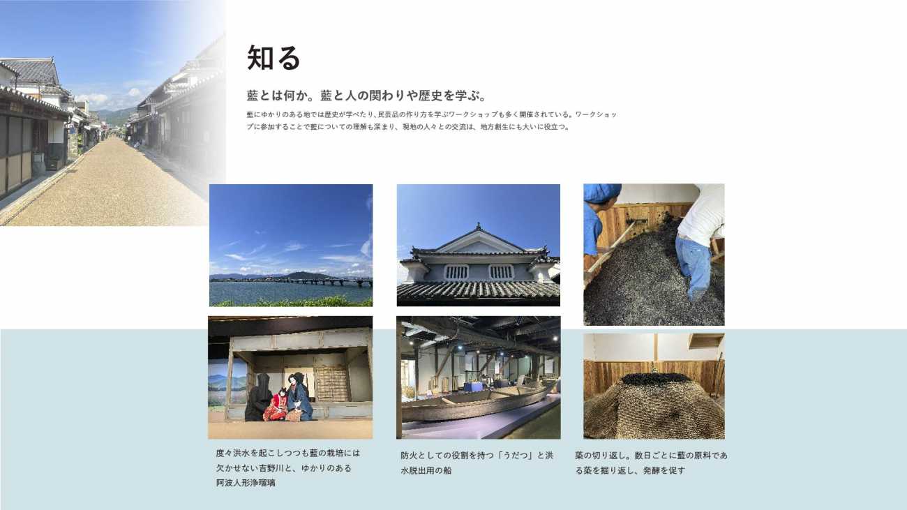 5つの視点の一つ「知る」について。藍染めの生産地を訪れることで、江戸時代の歴史や人との関わりを学びます。