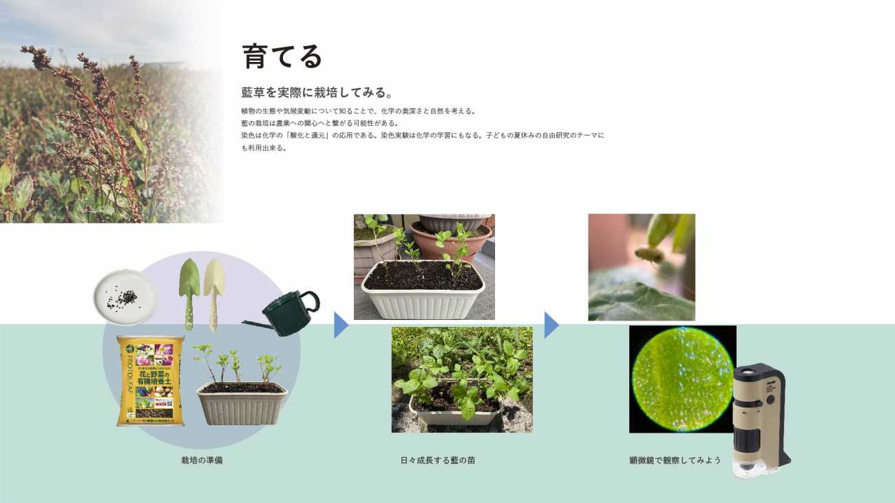 「育てる」について。藍草を実際に育ててみることで、自然や生態系、化学について考えます。