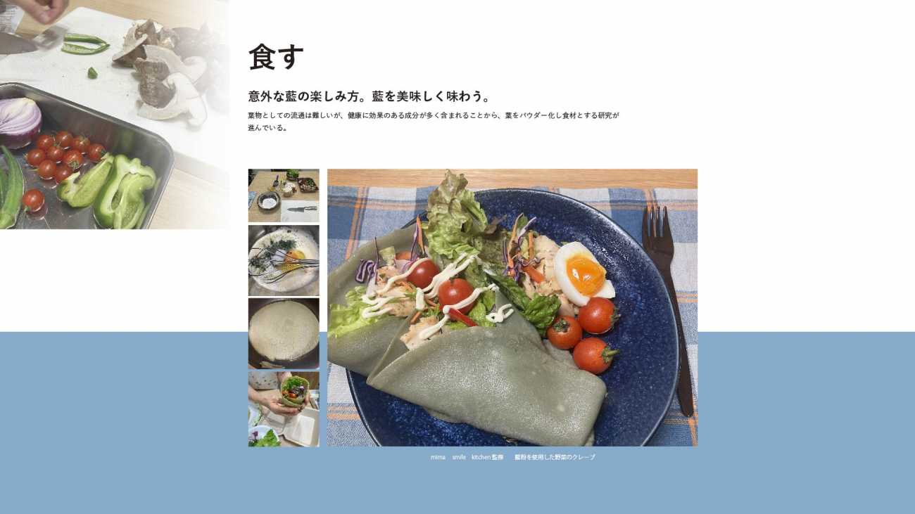 「食す」について。藍は栄養価の高い植物です。葉をパウダー化し、料理に取り入れる研究も進んでいます。