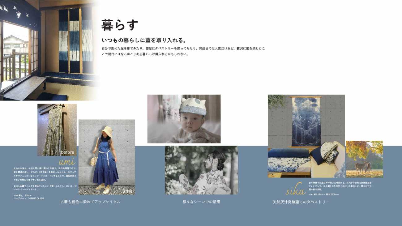 5つめの視点「暮らす」について。自分で染めた衣服を着てみたり、染めたタペストリーを部屋に飾ってみたりする。身近に藍のある暮らしを提案します。