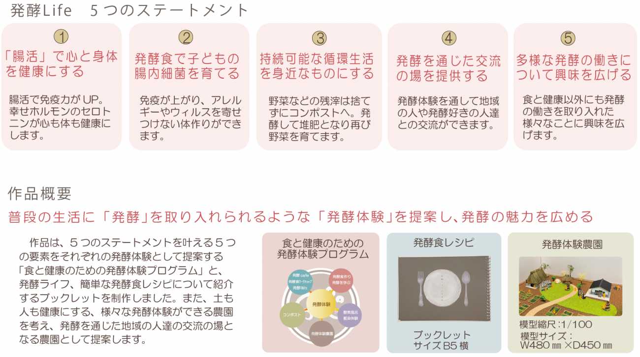 この「発酵Lifeのすすめ」という作品は、土も人も健康にする発酵体験の提案と、普段の生活に発酵食を取り入れることを目的としています。