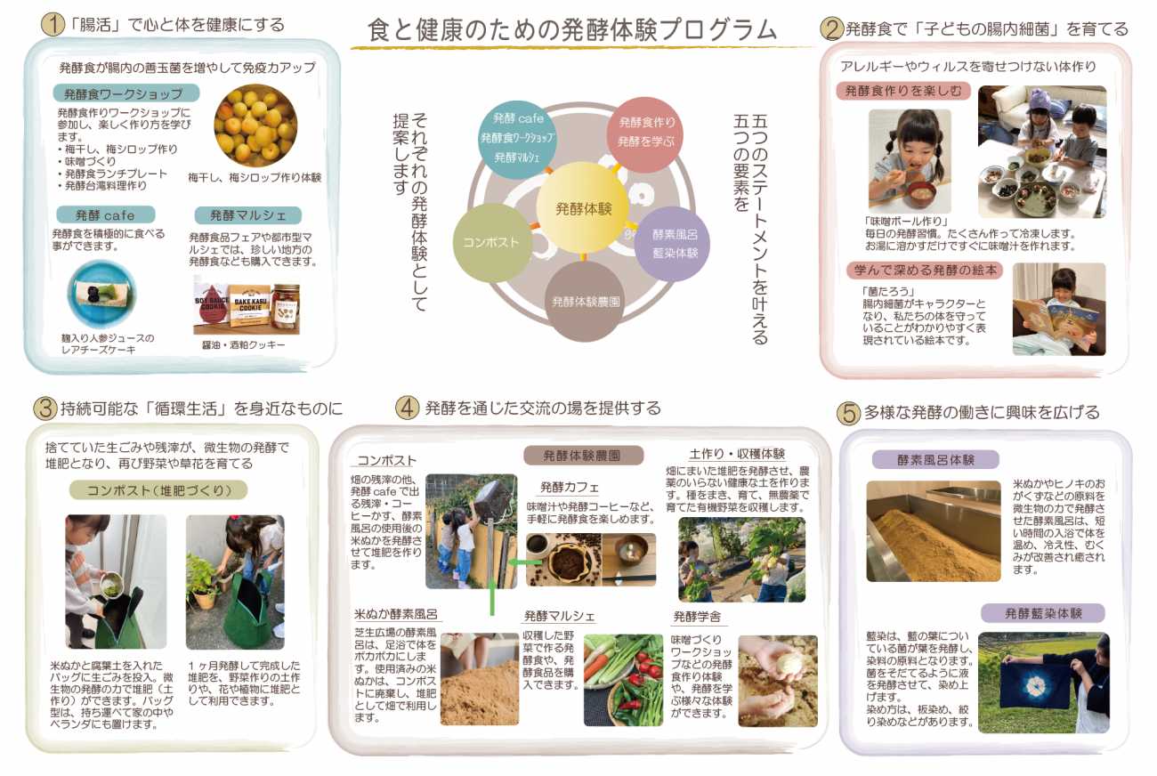 発酵は人間に有益な微生物の分解作用です。腸を元気にして免疫力を上げる発酵食を積極的にとれる仕組みや、発酵を通じた食の循環を体験できるプログラムを毎日の生活の中に取り入れることで、様々な発酵の働きを知り、心と身体を健康にすることを目的としています。