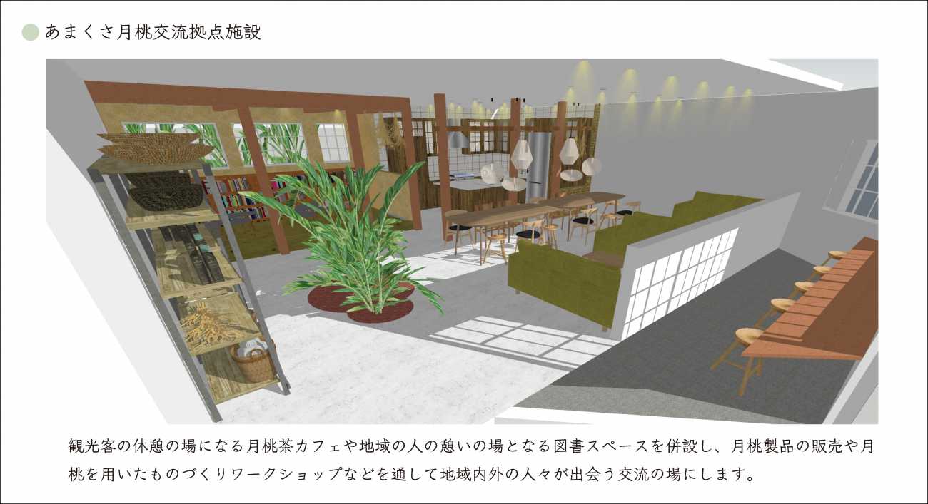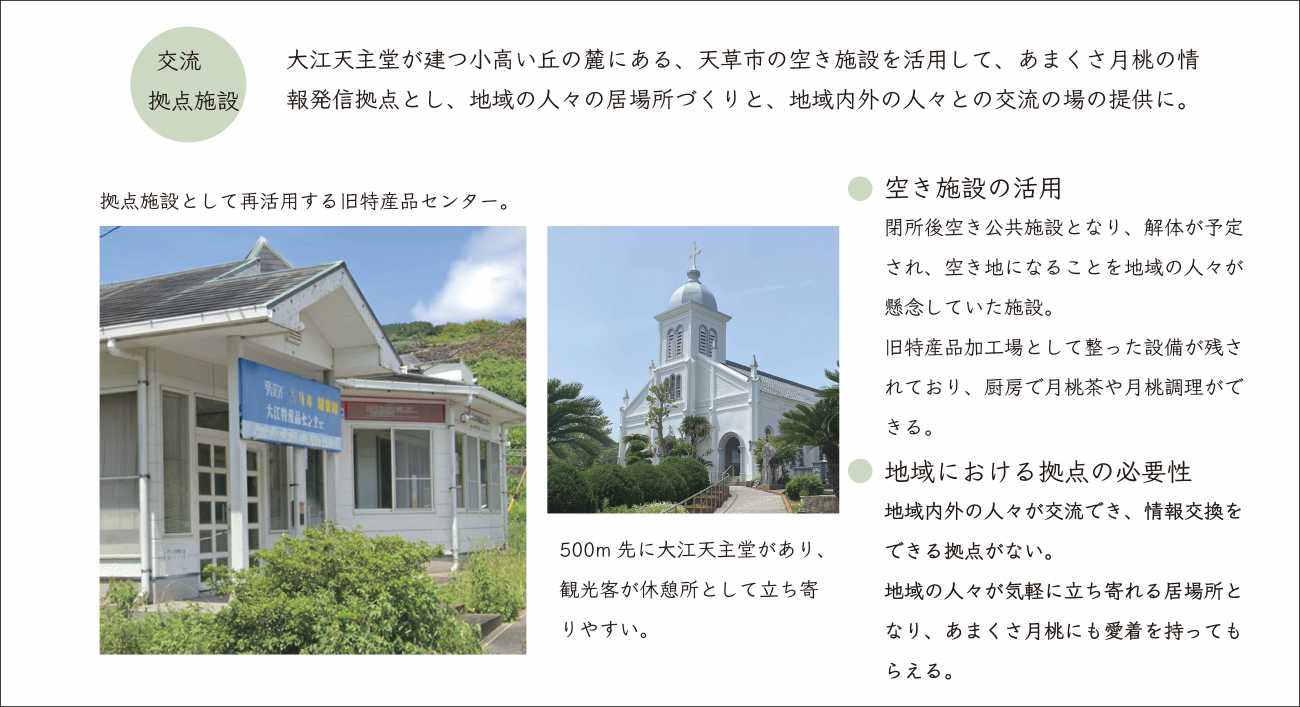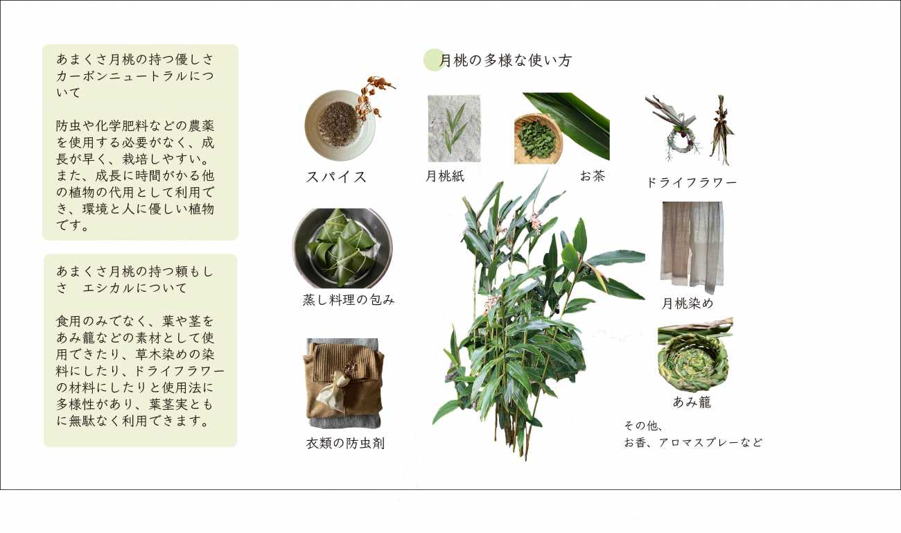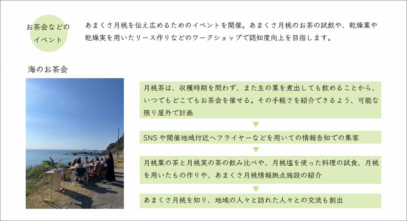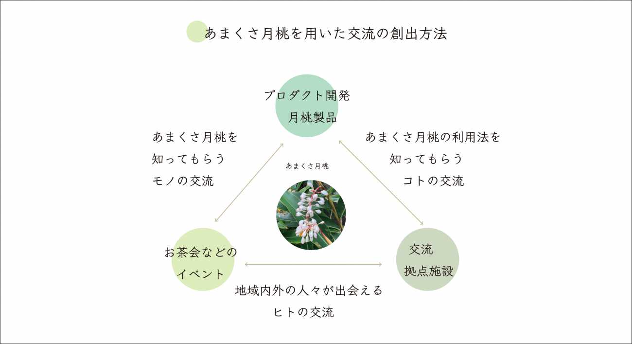 あまくさ月桃の特性である多様な活用方法を持つということは、一辺倒ではない様々な関係性をつくることができます。 天草地域の賑わいの創出などの活性化に繋げるためには、①あまくさ月桃という名称で、天草産月桃であることをPRするプロダクトとする 必要があること。②それをお茶会などのイベントで多くの人々に伝え広めるための機会を持つこと。また、③あまくさ月桃をいつでも手に入 れることができ、それらの情報を発信できる拠点施設があること。そしてそれらを手に取り、使用し、体験することで、それぞれの人々が モノ、ヒト、コトの交流を創出し循環させ、長期的な活動を目指します。