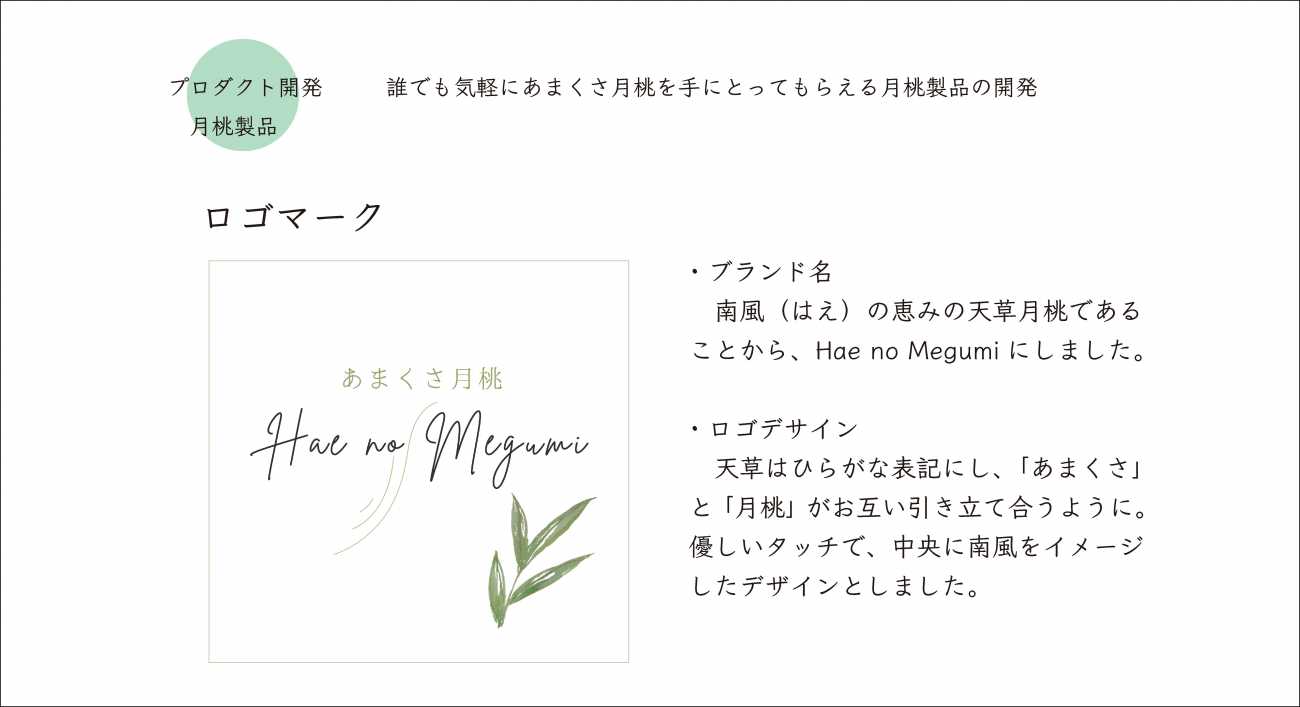 プロダクト(月桃商品)は、誰でも手軽にあまくさ月桃に慣れ親しんでもらえるように月桃茶と、あまくさ月桃の多様な使用方を紹介した 月桃本を。また、より天草の魅力をPRするために、他の天草の特産物の天然塩や、天草陶石とのコラボレーションで開発を行いました。 天草はたくさんの良いものや珍しいものが、海から伝わってきた歴史的背景のある地域です。そしてそれらを寛容に受け入れる地域の人々 の穏やかな人間性を感じるところです。「あまくさ月桃 Hae no Megumi」は、そのような天草の穏やかな地域性を感じられることをブラ ンディングコンセプトとし、ロゴマークは親しみを持ってもらえるようなフォントデザインにしました。ロゴの中央に配した南風が恵みを もたらしていることを表現しています。