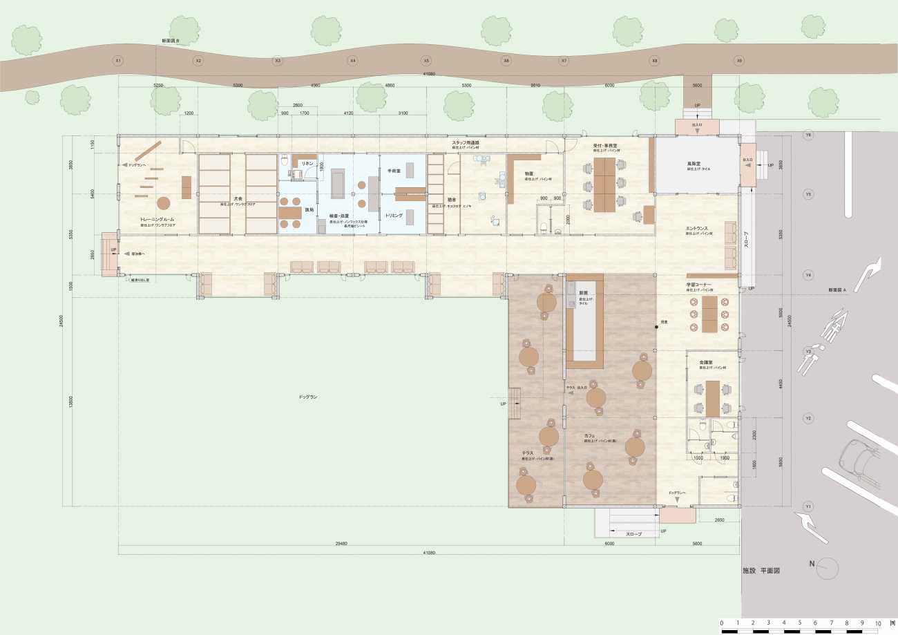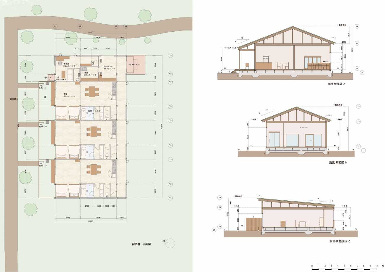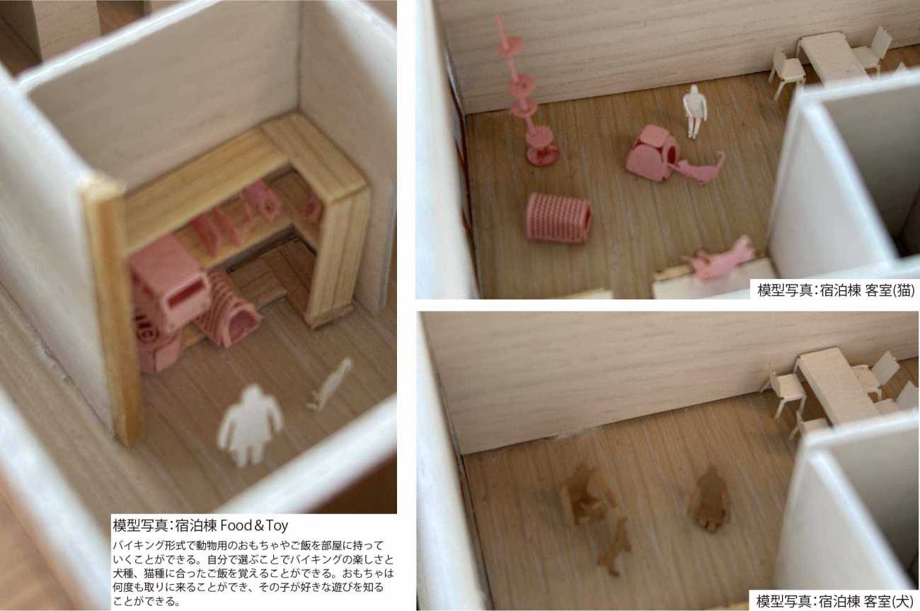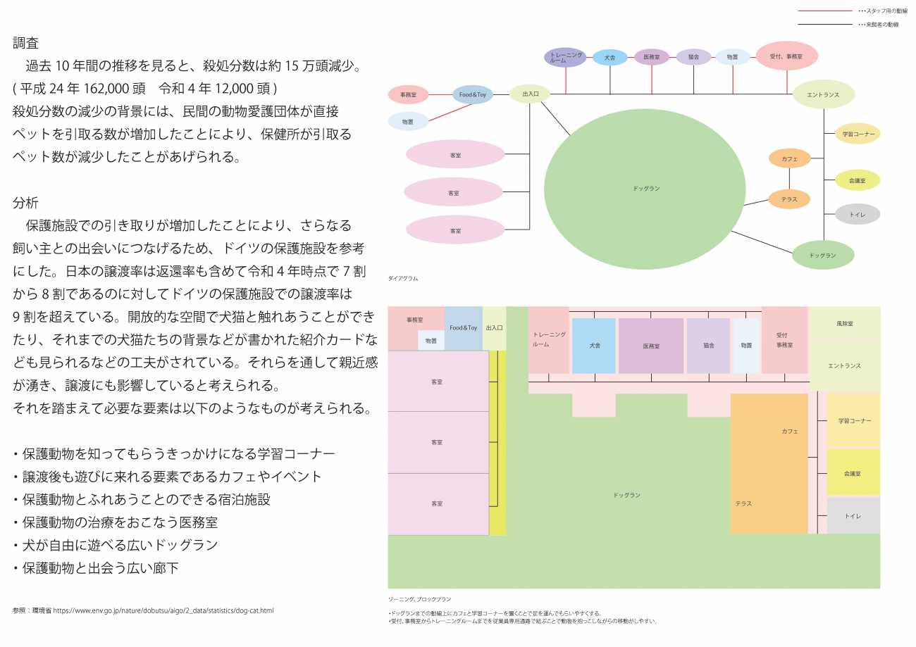 コンセプト:従来の保護施設をよりよくするためには、どのような要素を加えたら問題解決につながるのかを考えた結果、実際にペットとの暮らしを体験できる宿泊施設を設け、そのトライアル期間に専門のスタッフに相談できる機会を設けたいと思った。また、譲渡後もスタッフや飼い主同士のコミュニケーションの場として活用してもらえるように、ドッグランや散歩コースを設置した。また、週に一度「ふれあいイベント」を開催して、子供たちにもペットについて学んでもらうきっかけの場とした。