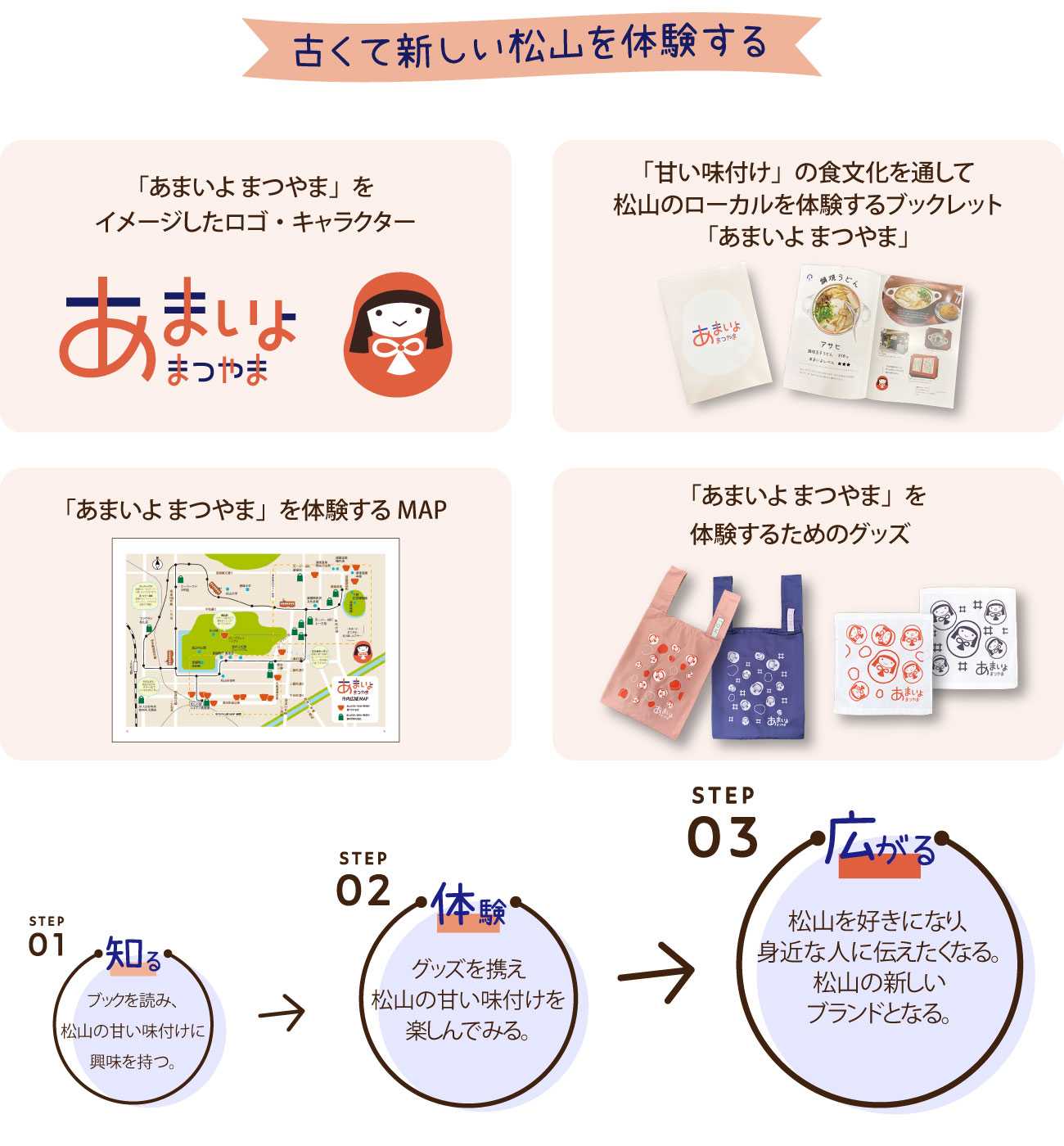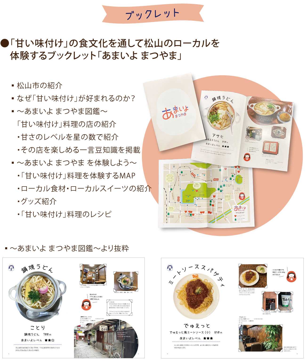 ブックレットに松山の甘い味付け料理の店やレシピを紹介して興味を持ってもらい、マップを頼りにグッズと一緒に松山を体験します。そうすることで松山のファンづくりを目指します。