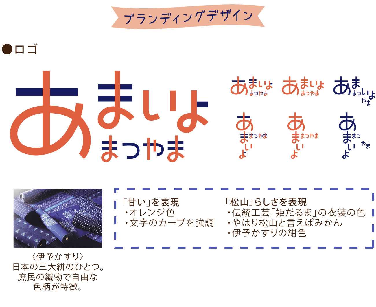 この地域ブランディングに共通するイメージ・連動感を持たせるため、ロゴとイメージキャラクターをデザイン。ロゴでは文字のシルエットとカラーで松山と甘い味付けをデザイン。 ※画像出典:まじめ愛媛