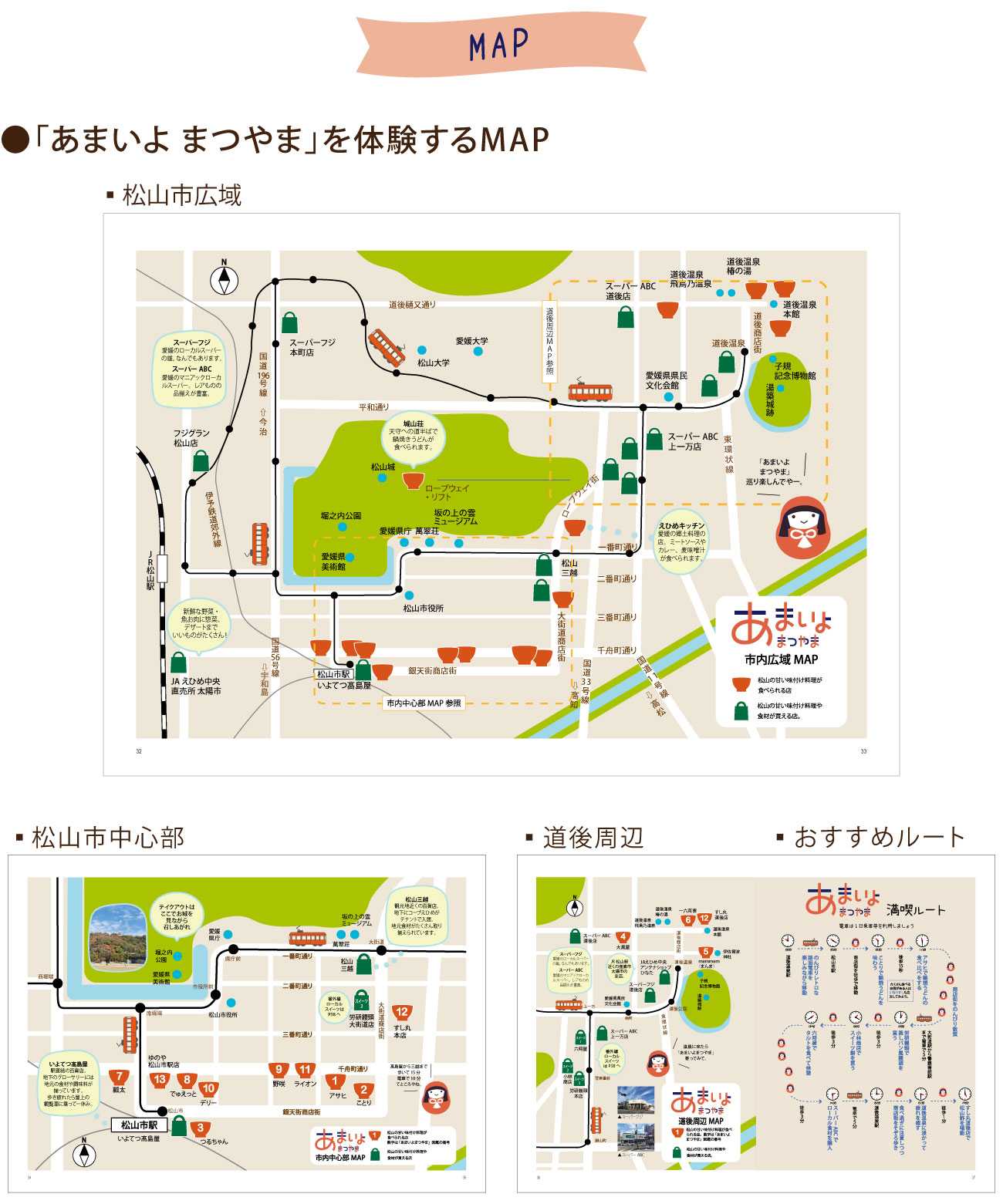〜あまいよ まつやま図鑑〜にてピックアップした甘い味付け料理14店やローカル食材、スイーツを購入できるショップをMAPで紹介。古くからある松山を体験して新しい松山を知ってもらう。
