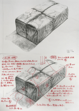 自宅学習で、鉛筆デッサンやコラージュなどに取り組みます。美術科の多くの学生が入学してまず取り組む科目で、他学科の学生にも人気の科目です。