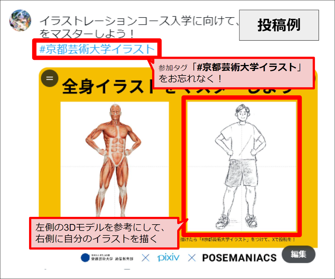 3)描いたイラストを、参加タグ「#京都芸術大学イラスト」をつけて、ご自身のXアカウントで投稿してください。